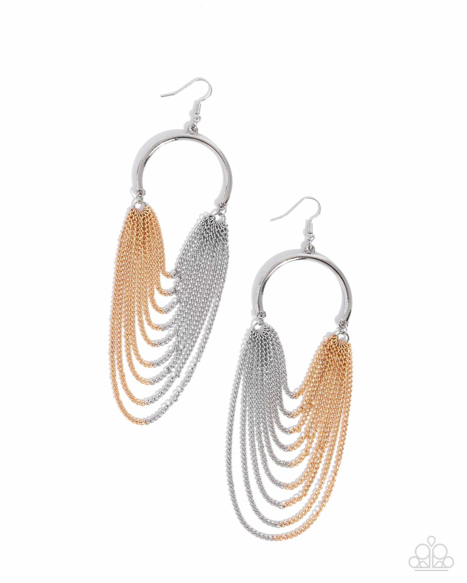Gathered rows of half-dipped gold and silver chains cascade from the bottom of a shiny silver arch, creating a glamorously glitzy fringe. Earring attaches to a standard fishhook fitting.