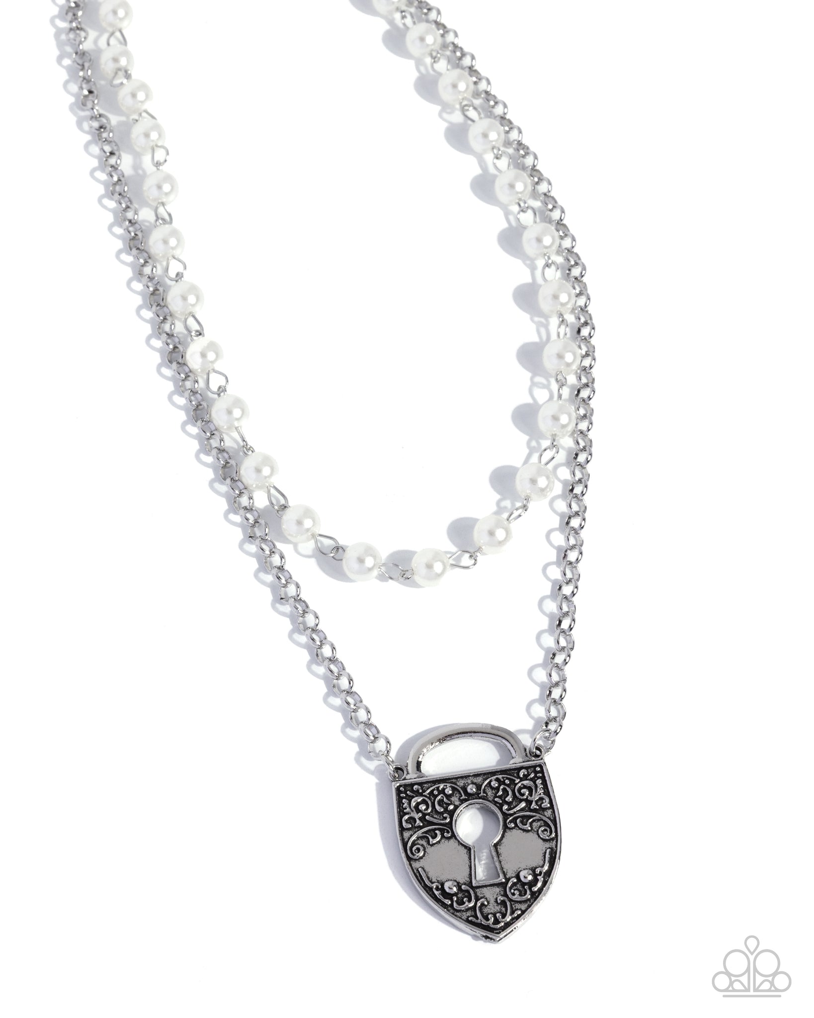 Detailed in curly filigree, an antiqued silver shield-like padlock pendant is centered along a silver cable chain while a glossy white pearl-dotted chain sways above it for a polished, persistent display. Features an adjustable clasp closure.