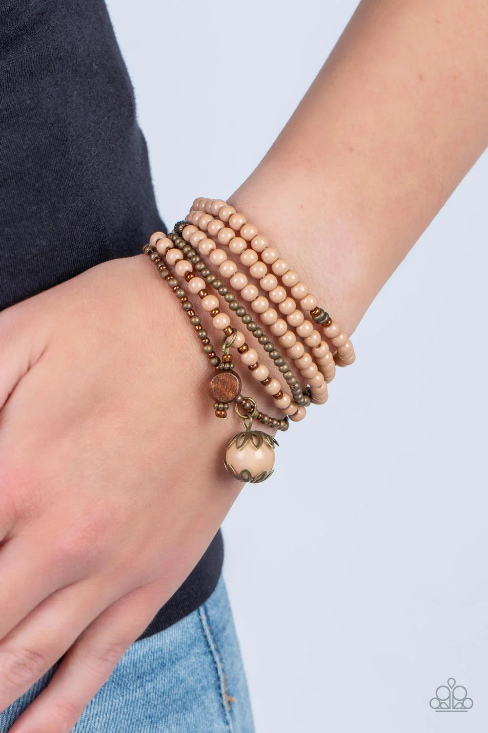 A mismatched collection of copper, brass, wooden, and white beads are threaded along stretchy bands around the wrist. An ornate white bead and wooden bead trickles from the layers, adding whimsical accents to the earthy display.
