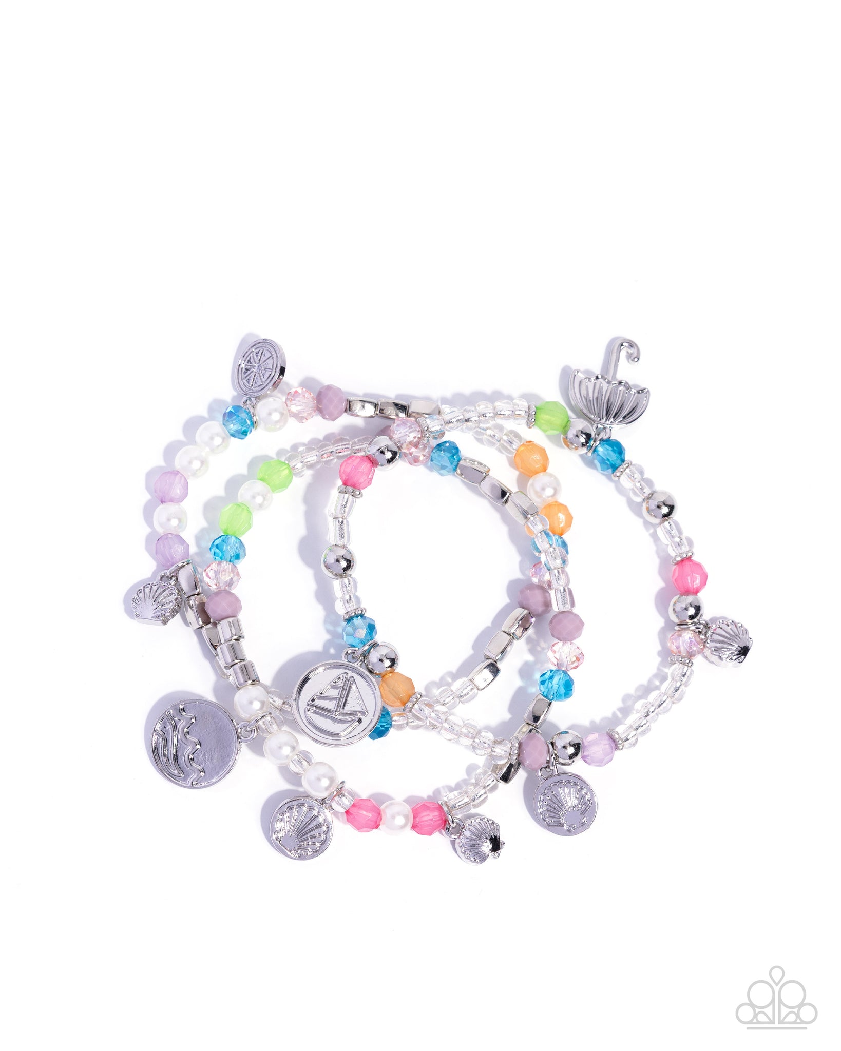 Infused along elastic stretchy bands, a collection of white pearls, silver beads, faceted multicolored beads in a variety of opacities and shimmers, and clear beads stack along the wrist for a colorful display. Coastal-inspired silver charms, including an umbrella, seashells, sand dollars, a sailboat, a wave, and a lemon slice, sporadically sway along the strands for an opulent, oceanic finish. Sold as one set of three bracelets. Intended for adult use.