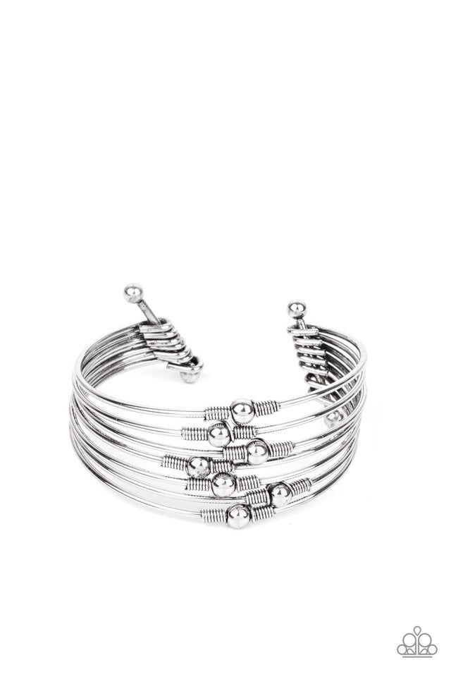 Held in place by silver wire fittings, classic silver beads haphazardly dot dainty silver bars that connect into a layered cuff around the wrist.