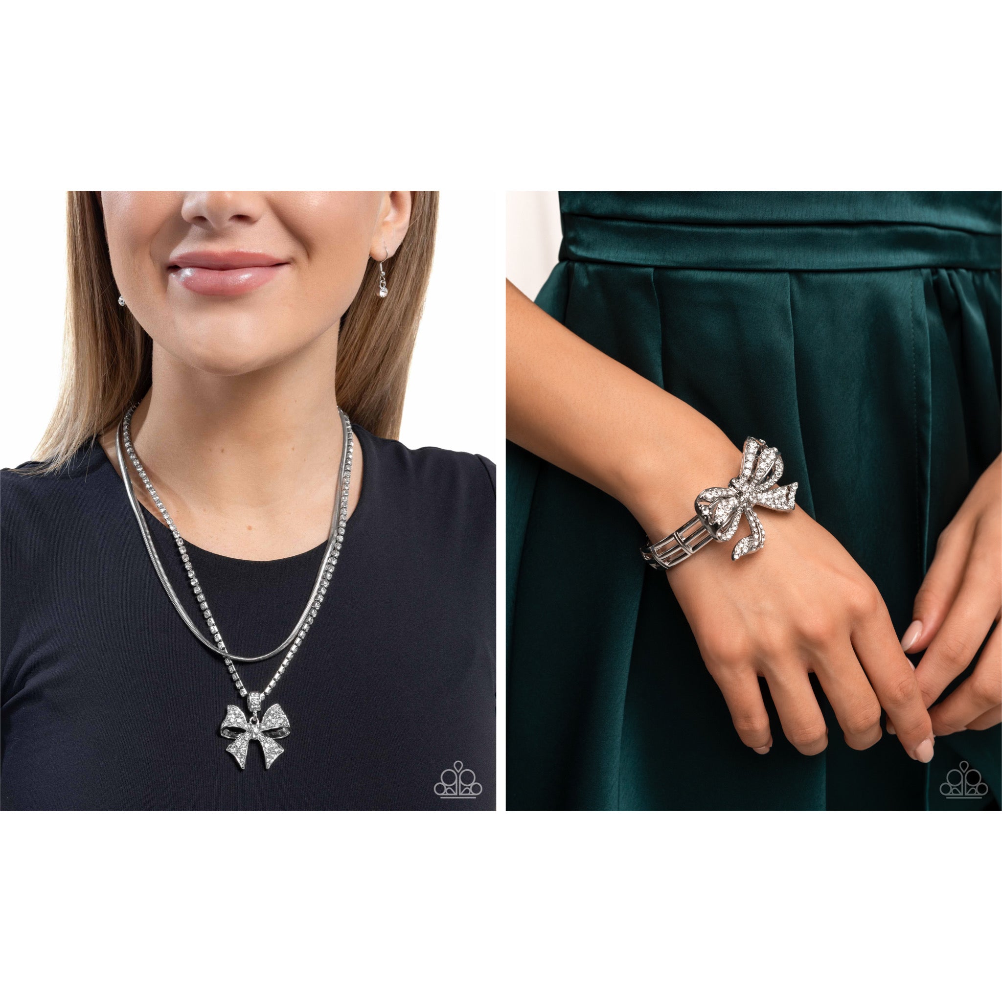 Featuring a layered design with a sleek silver herringbone chain and a strand of shimmering white rhinestones, a bow-shaped pendant, encrusted with matching rhinestones, creates a charming centerpiece. Features an adjustable clasp closure.