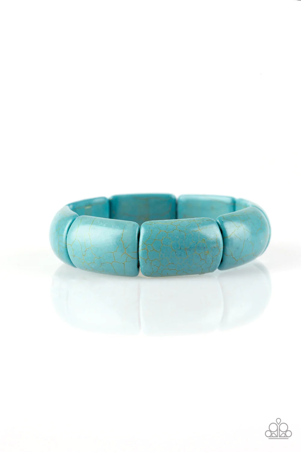 Chiseled into smooth rectangular frames, refreshing turquoise stone pieces are threaded along stretchy bands and linked around the wrist for an earthy look.