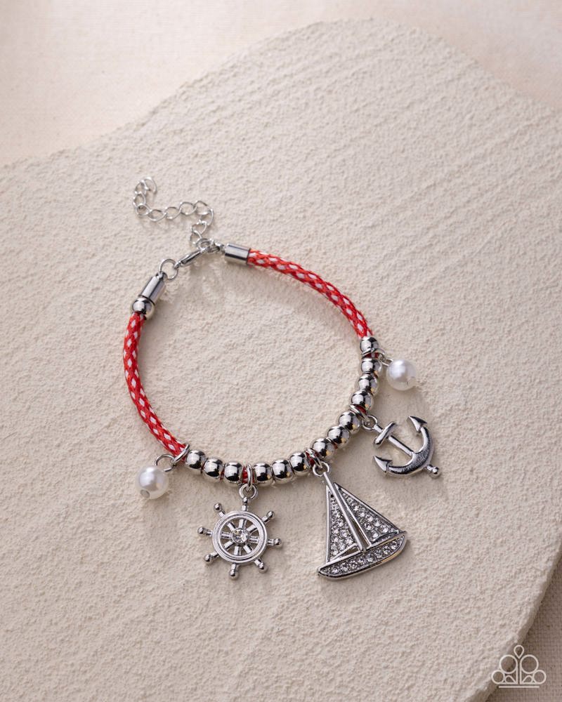 Infused along a red-and-white-patterned cord, a collection of glossy silver beads alternates with glossy white pearls, a silver anchor, a silver helm with a white rhinestone center, and a white rhinestone-embellished silver sailboat for a radiant, river-inspired display. Features an adjustable clasp closure. Sold as one individual bracelet. Intended for adult use.