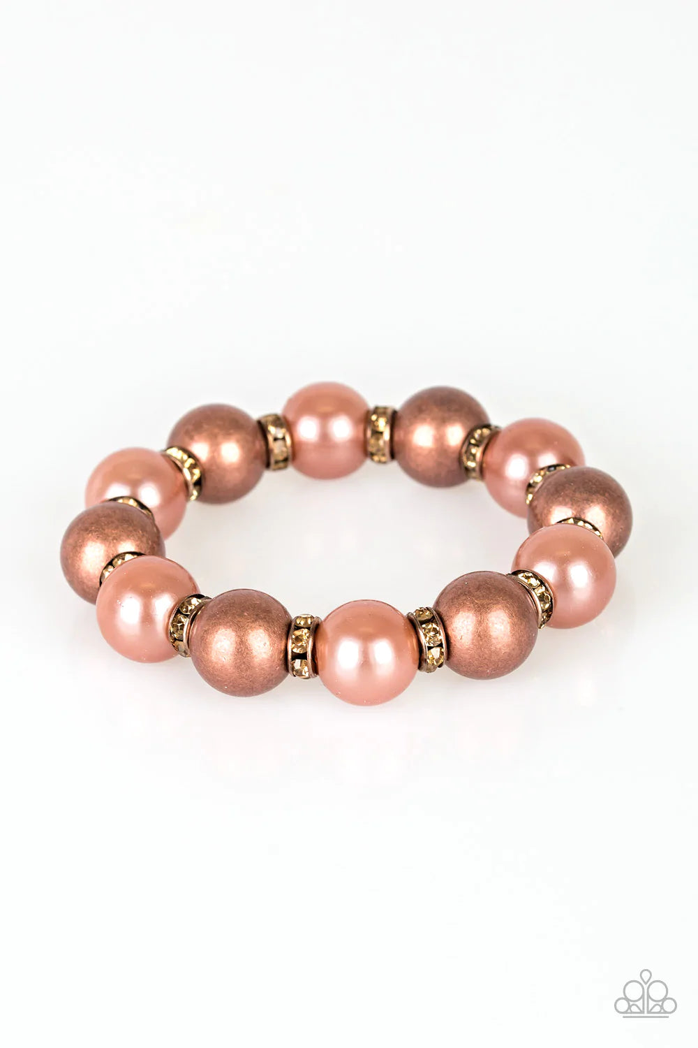 A collection of topaz rhinestone encrusted rings, pearly copper beads, and classic copper beads are threaded along a stretchy band around the wrist for a glamorous look.