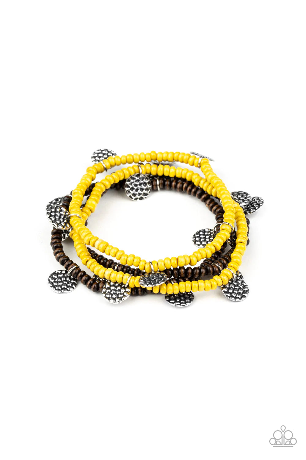 Infused with hammered silver discs, a dainty collection of brown and yellow wooden beads are threaded along stretchy bands around the wrist, creating colorful layers.