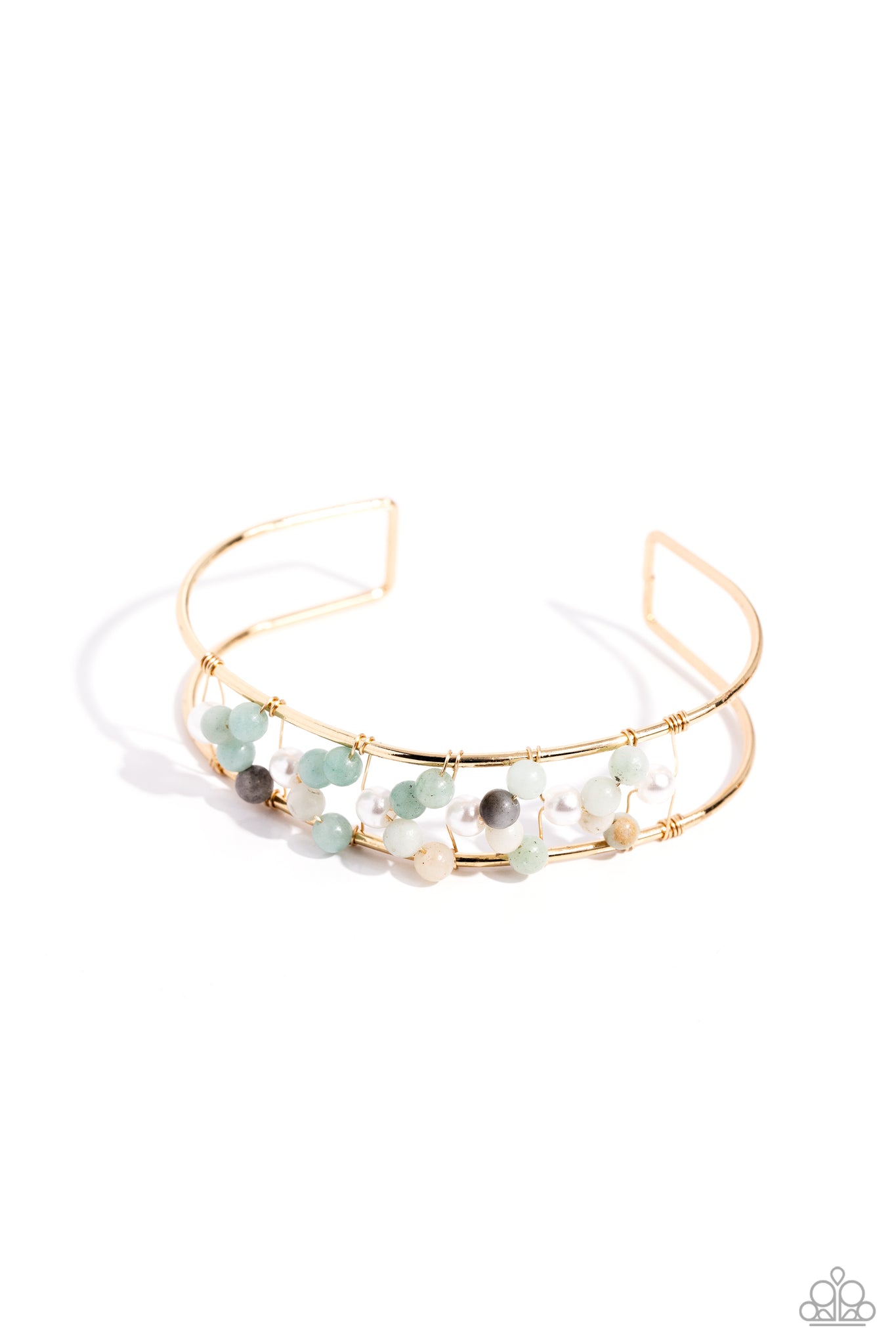 An earthy collection of blue stones and glossy white pearls are wrapped along the center of an airy gold cuff by a shimmery gold wire for a handcrafted finish. As the stone elements in this piece are natural, some color variation is normal.