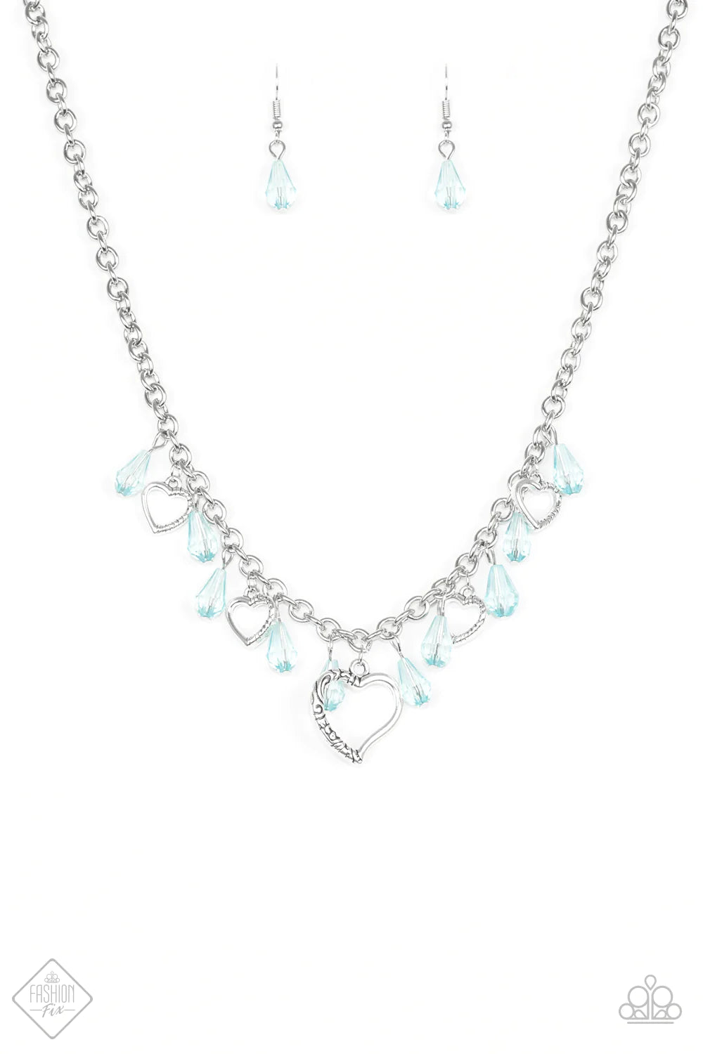 Crystal-like teardrops in the refreshing shade of Blue Radiance drip from the bottom of a shimmery silver chain. Stamped in ornate patterns, glistening silver heart silhouettes trickle between the colorful accents, creating a whimsical fringe below the collar. Features an adjustable clasp closure.