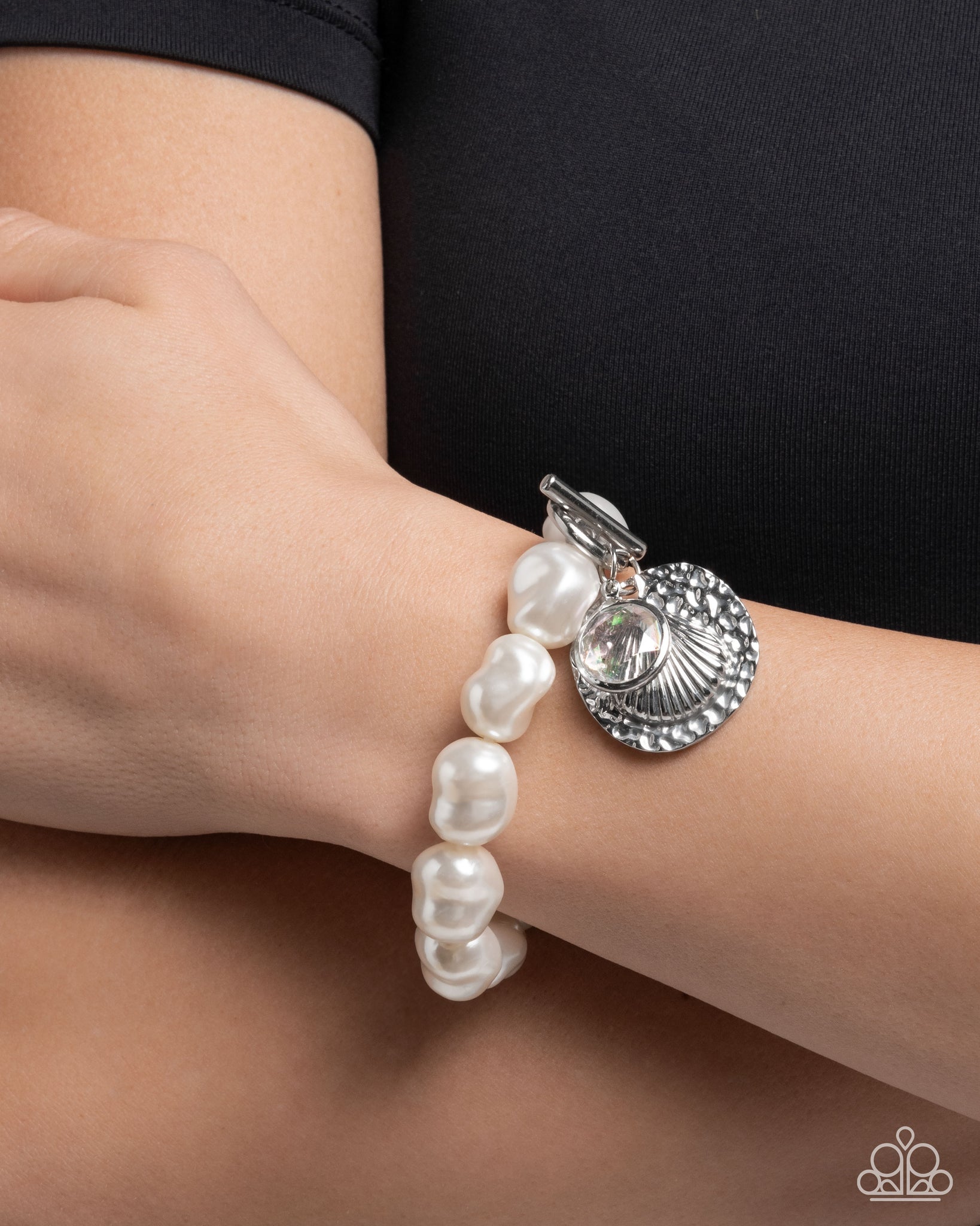 A series of lustrous baroque white pearls thread around the wrist, creating a timeless and elegant look. An ocean-inspired silver charm and a glassy clear disc, dangles from the bracelet for added movement and whimsy. Perfect for a seaside or sophisticated ensemble, this bracelet effortlessly combines classic and coastal aesthetics.