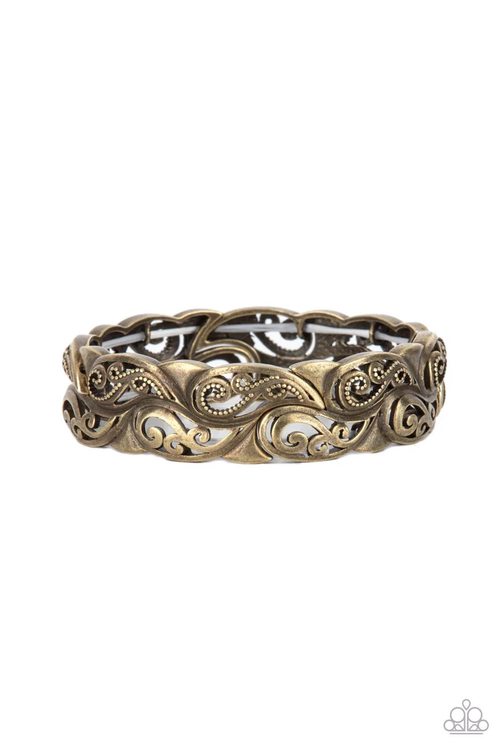 Antiqued brass paisley patterned frames are threaded along stretchy bands around the wrist, creating a rustic centerpiece.