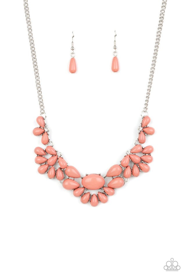 Teardrop Pale Rosette beads fan out from the bottoms of solitaire white rhinestones as they link below the collar, creating whimsically stacked frames. Featuring an oval center, oversized teardrop beads flare out from the centermost frame for a flirtatiously floral finish. Features an adjustable clasp closure.