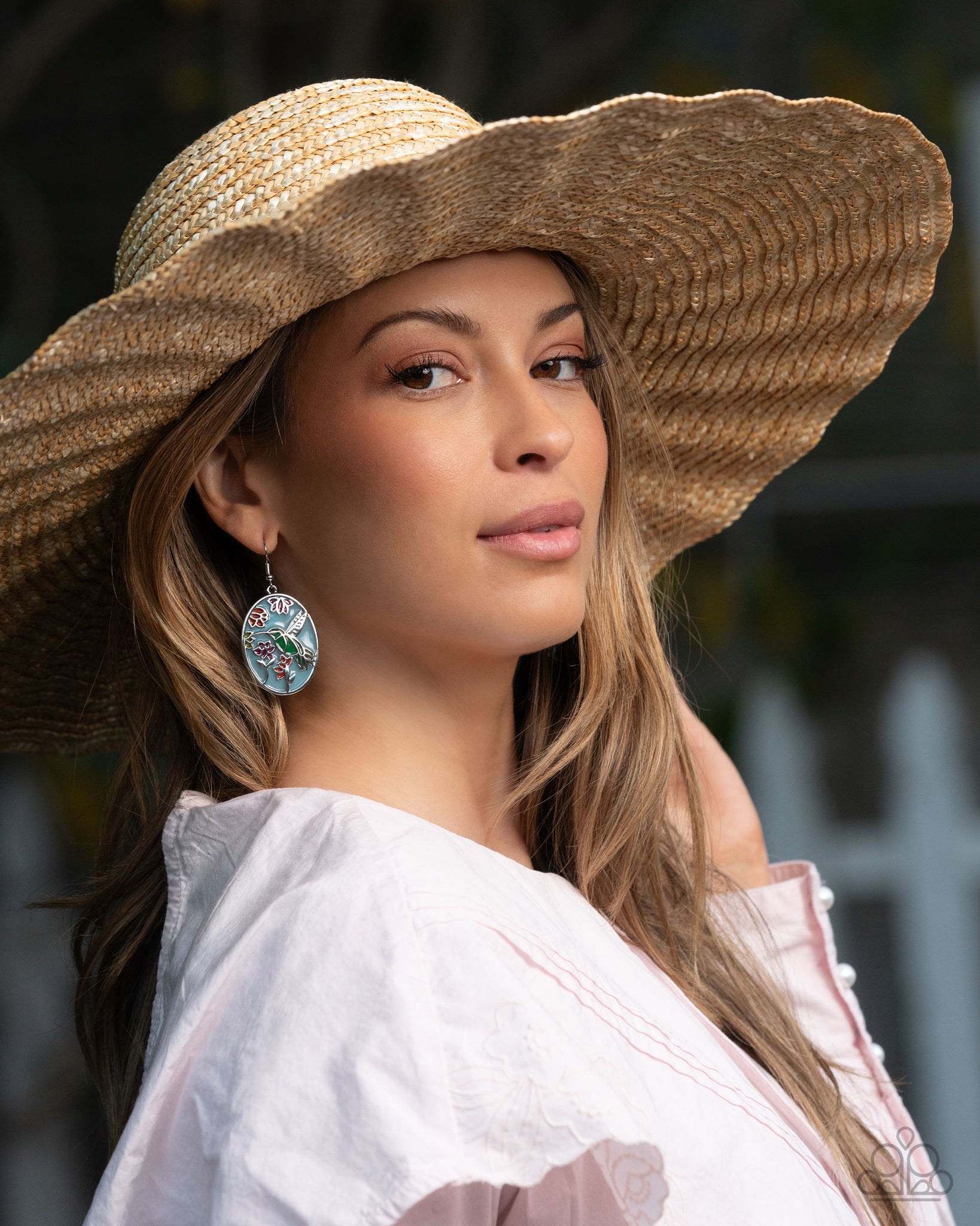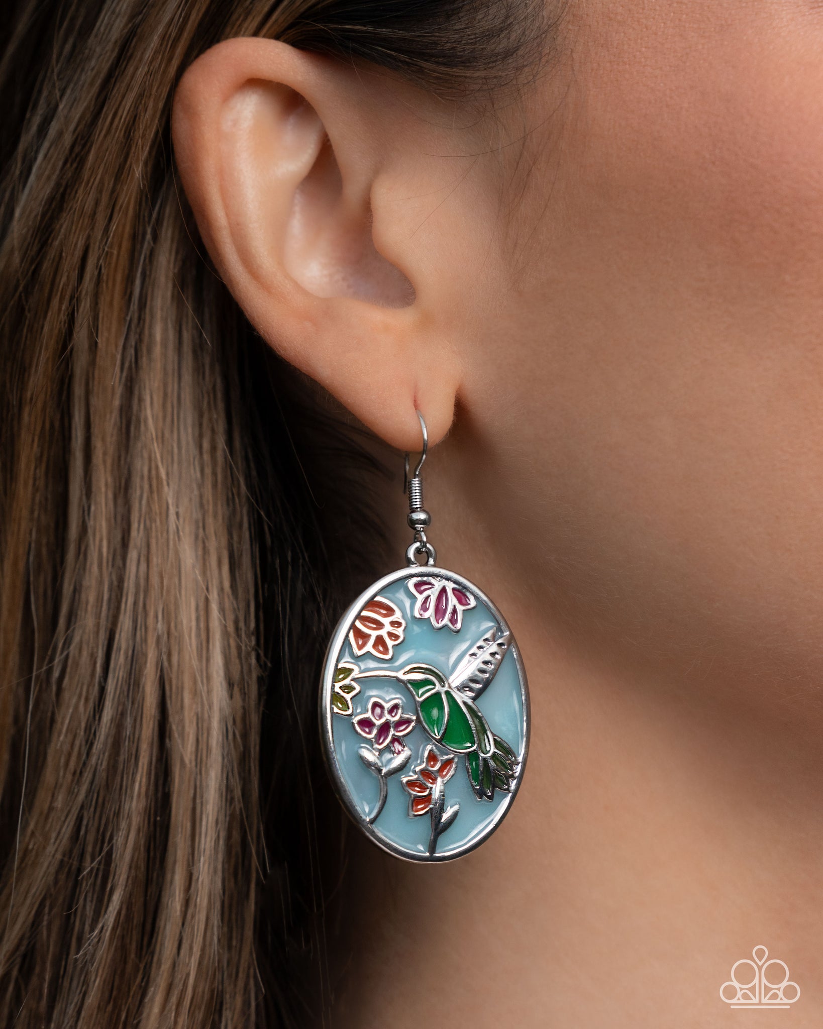 Featuring Limpet Shell, Green Grass, Pink Peacock, Orangeade, and Marigold spots of paint, a hummingbird flutters against a silver oval backdrop full of colorful flowers for a whimsically radiant lure. Earring attaches to a standard fishhook fitting.