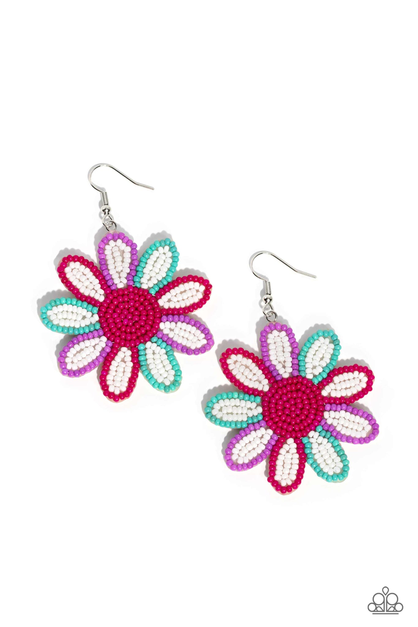 Layers of white seed bead petals, encased in seed bead frames of hot pink, tiffany, and lavender fan out from a hot pink seed bead center, blooming into a textured floral lure. Earring attaches to a standard fishhook fitting.