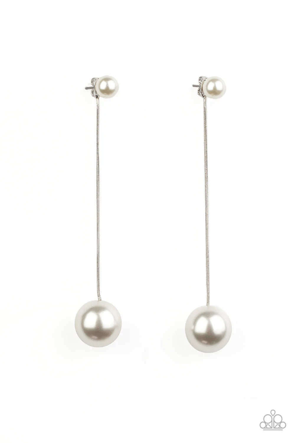 Attached to a sleek silver chain, an oversized white pearl delicately swings from the bottom of a classic white pearl, adding a timeless twist to the elegant display. Earring attaches to a standard post fitting.