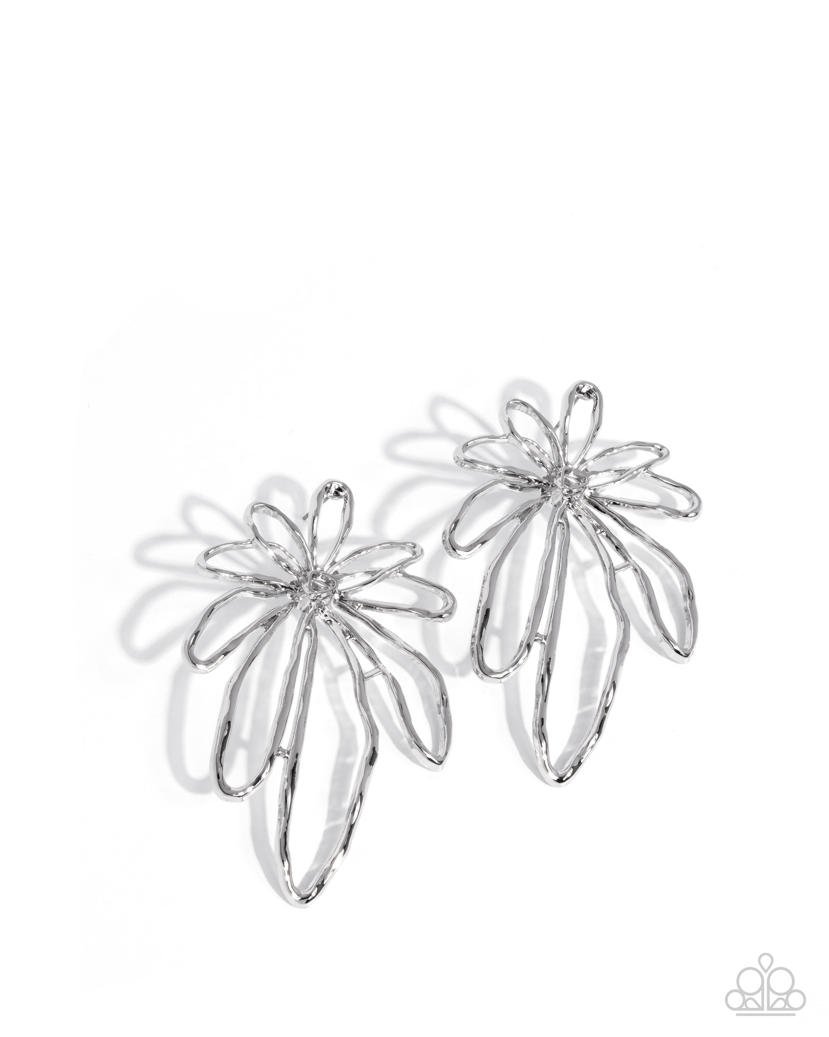 Intricate wires with a silver finish are shaped like petals and knotted in the center to create a delicate silhouette of a daisy, elongating below the ear for a wildly whimsical centerpiece. Earring attaches to a standard post fitting.