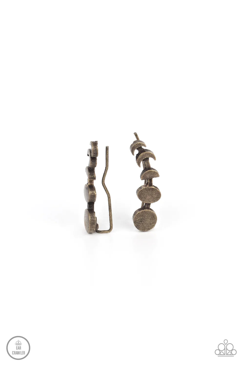 A dainty brass bar displays the phases of the moon as it curls across the ear for a stellar look. Features an extended post fitting that climbs the back of the ear and can be pressed together for a more secure fit.