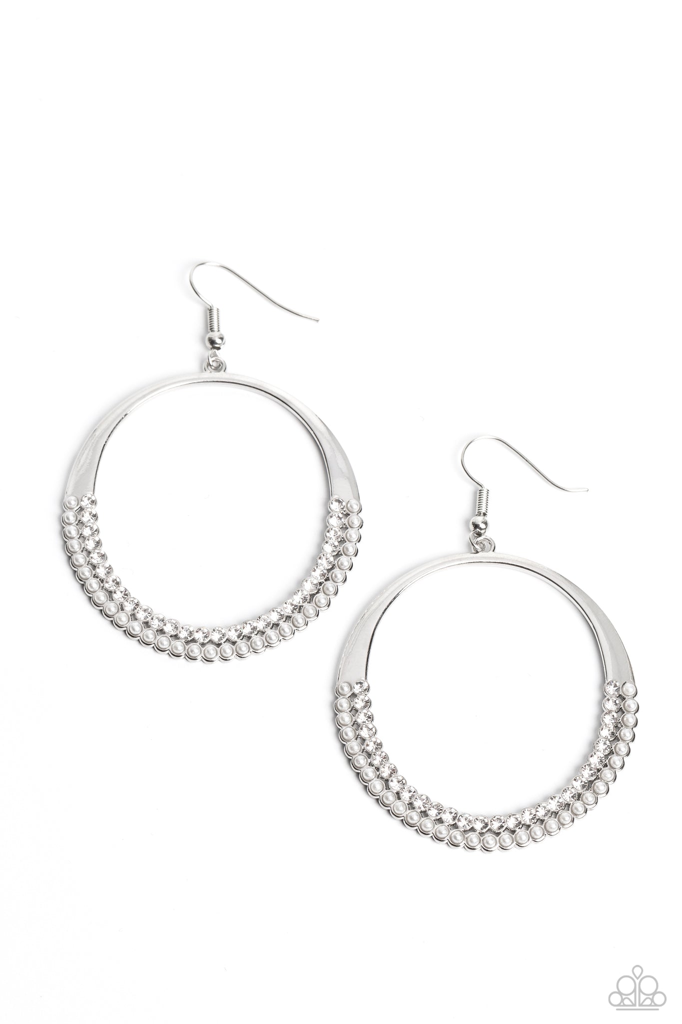 Encrusted on the lower curve of an oversized, dainty silver hoop, two dainty rows of white gems and classy white pearls add a subtle shimmer and refinement to the high-sheen statement piece. Earring attaches to a standard fishhook fitting.