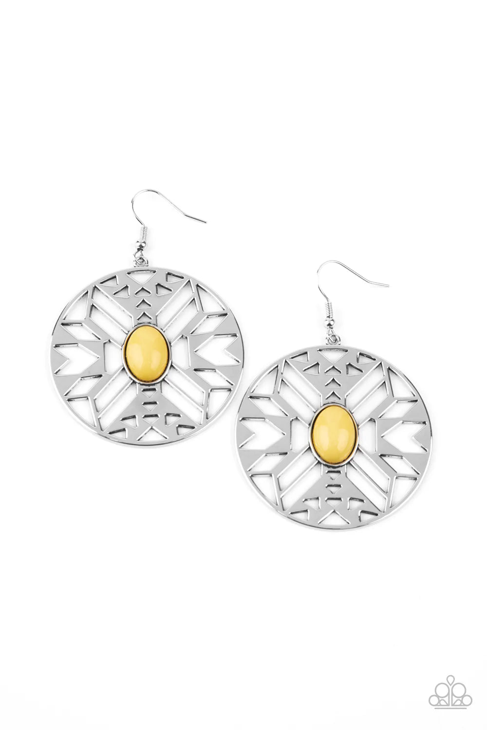 An oval yellow bead adorns the center of a round silver frame radiating with an airy southwestern inspired pattern for a whimsical look. Earring attaches to a standard fishhook fitting.