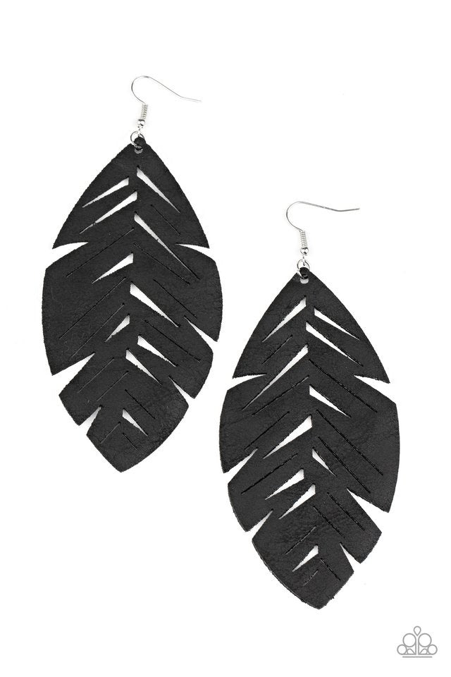 Featuring a rustic finish, a soft piece of black leather is cut and stenciled into an airy feather frame for a free-spirited look. Earring attaches to a standard fishhook fitting.