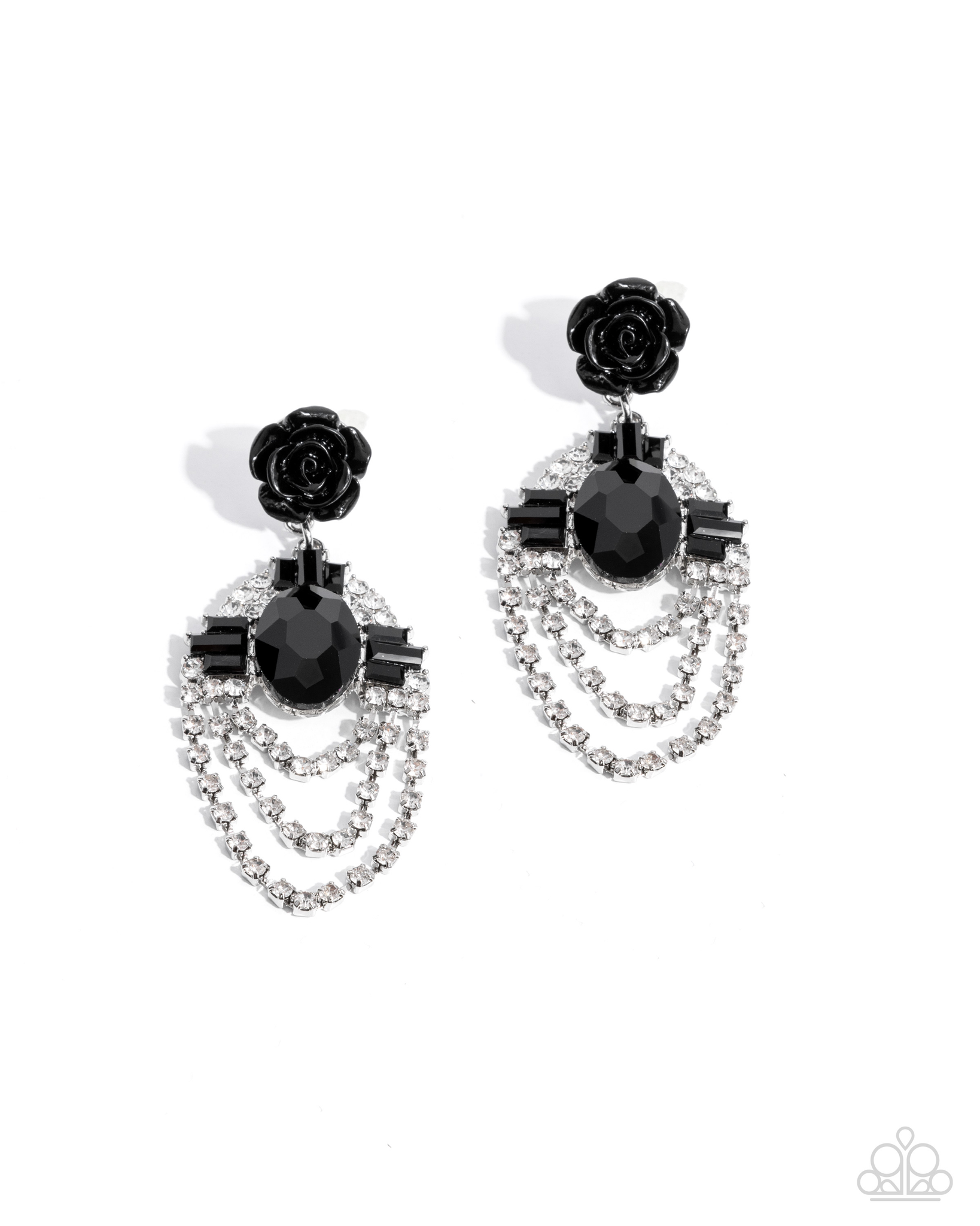Featuring a black hue, a glistening rosette post gives way to layers of white rhinestones in silver square fittings held together by trios of emerald-cut black gems surrounding a faceted black oval gem for a romantically rebellious look. Earring attaches to a standard post fitting.