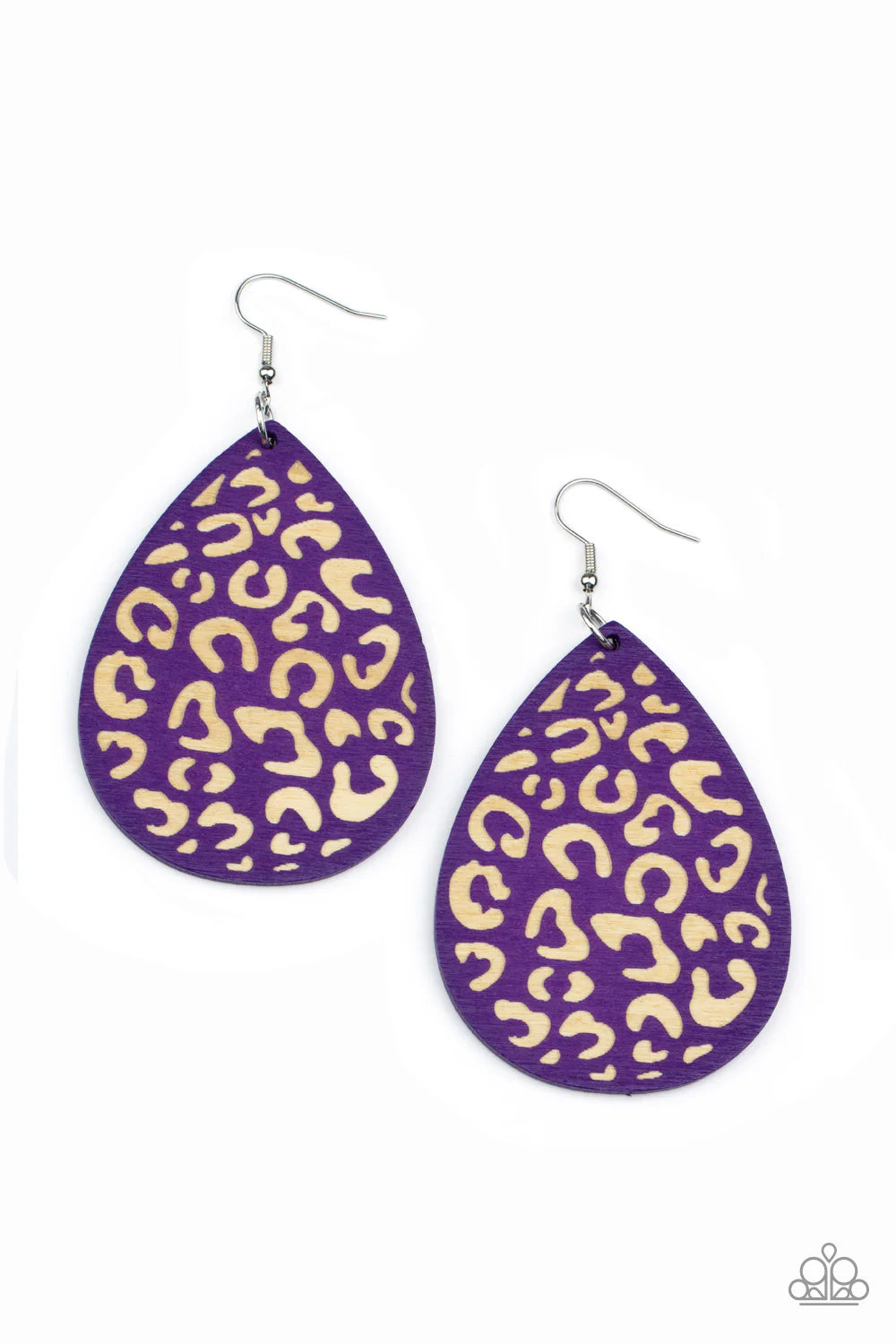A purple wooden teardrop frame is etched in a cheetah-like pattern, creating a wildly fabulous fashion. Earring attaches to a standard fishhook fitting.