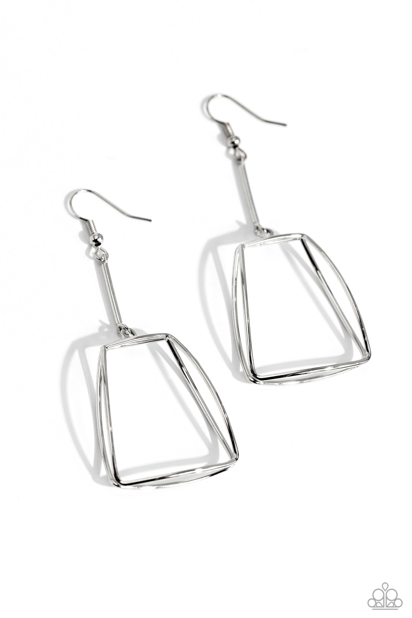 Suspended from a dainty silver rod, layers of silver wire delicately bend and stack into a trapezoidal frame for a 3-dimensional edge. Earring attaches to a standard fishhook fitting.