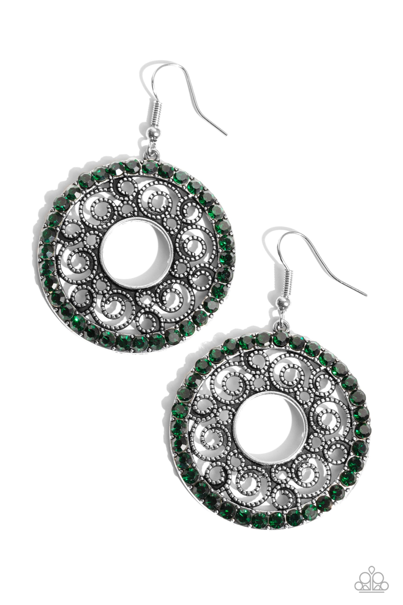Bordered in a ring of glittery green rhinestones, a rustic silver hoop is filled with whirly silver filigree for a wistful finish. Earring attaches to a standard fishhook fitting.