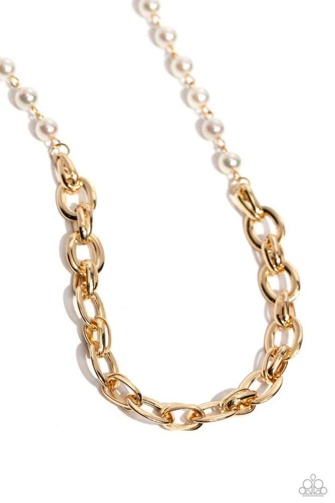 Gleaming Brush pearls combine with oversized gold links to create a half-and-half fashionable mashup down the neckline for a refined, carefree finish. Features an adjustable clasp closure.