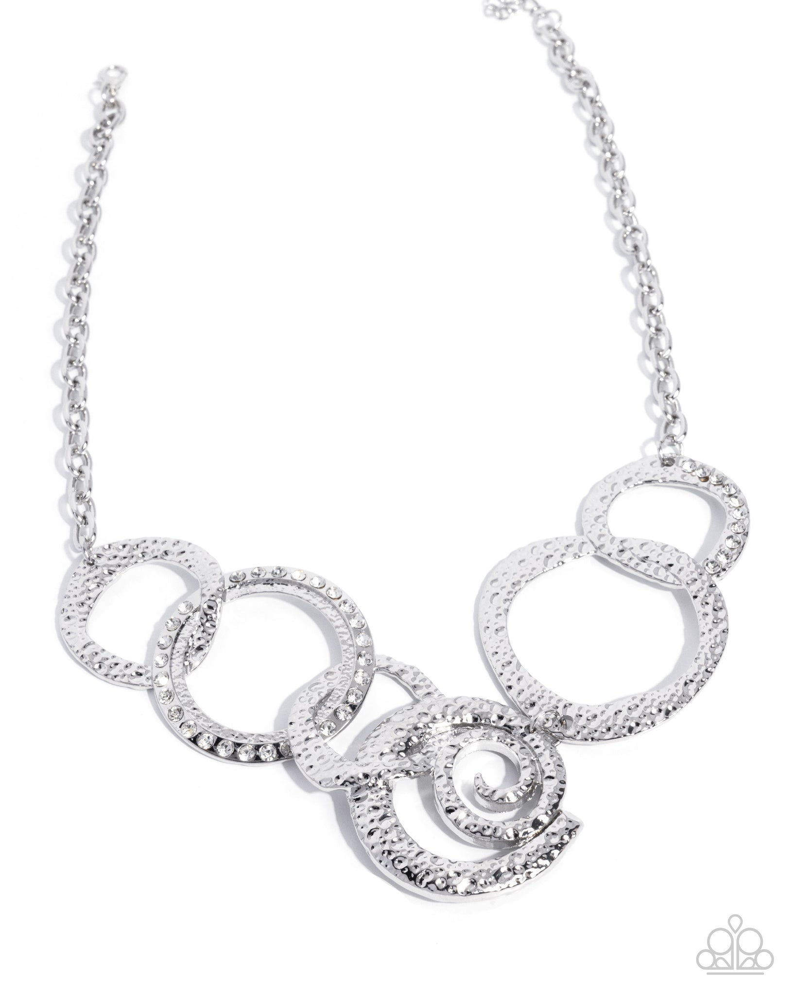 Connecting to a silver cable chain, a collection of abstract hammered silver rings, some embellished in white rhinestones, interconnects below the neckline, leading the eye to a hammered, silver spiral at the center for a radically refined display. Features an adjustable clasp closure.