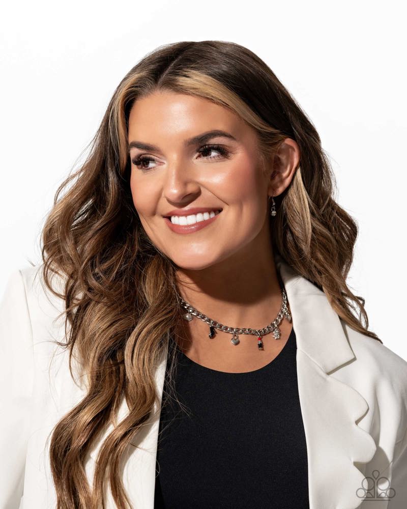 Dancing along a silver curb chain, a collection of trendy charms including a heart lock, a black white-gem embellished high-heel shoe, a red lipstick tube embellished with white rhinestones, a pearl pressed in a serrated frame, a silver rose, a solitaire white gem in a diamond frame, and a silver swan creates a shopaholic statement below the neckline. Features an adjustable clasp closure. Sold as one individual necklace. Includes one pair of matching earrings.