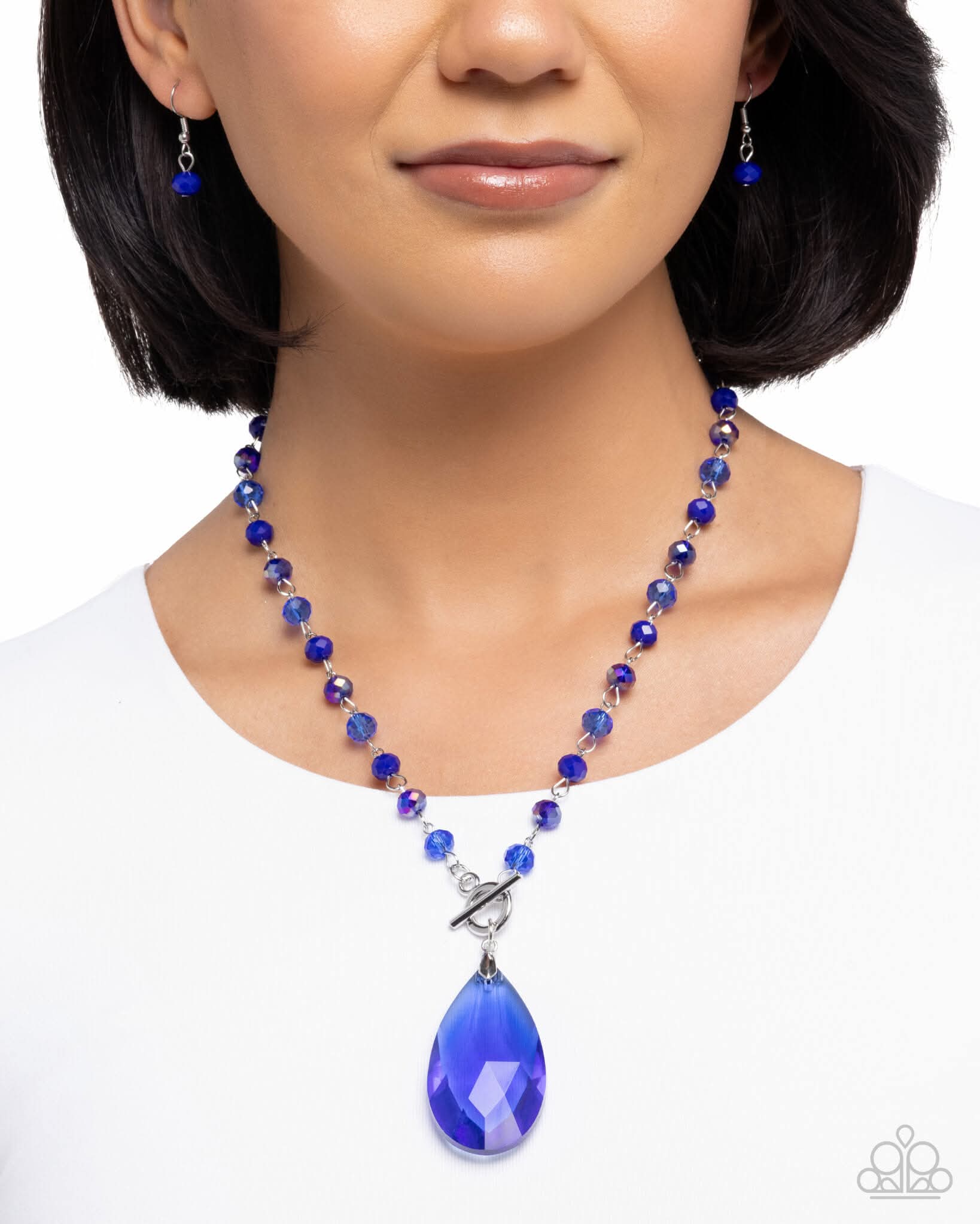 Infused along a classic silver chain, faceted blue and dark blue gems alternate and cascade below the neckline, leading the eye to an oversized blue teardrop gem, creating a radiantly refined look fit for royalty. Features an adjustable clasp closure.