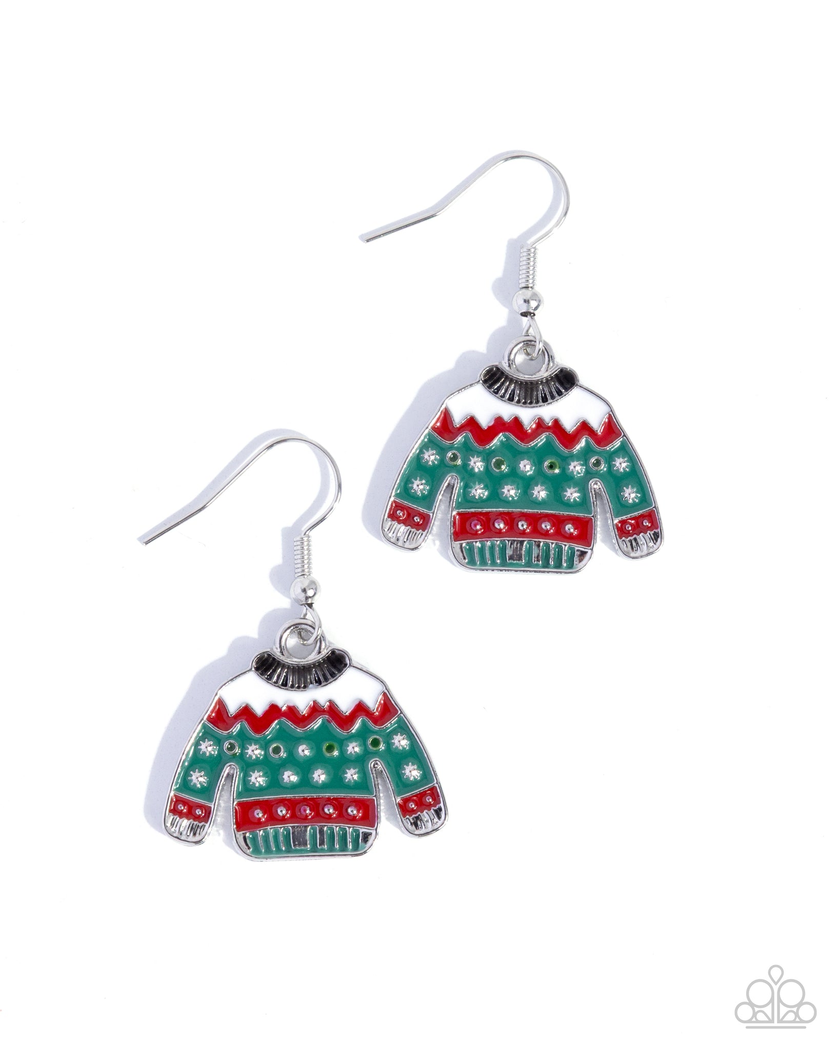 Featuring white, red, and green-painted hues, a detailed silver ugly sweater-inspired frame sways below the ear for a Christmas-y vibe. Earring attaches to a standard fishhook fitting.