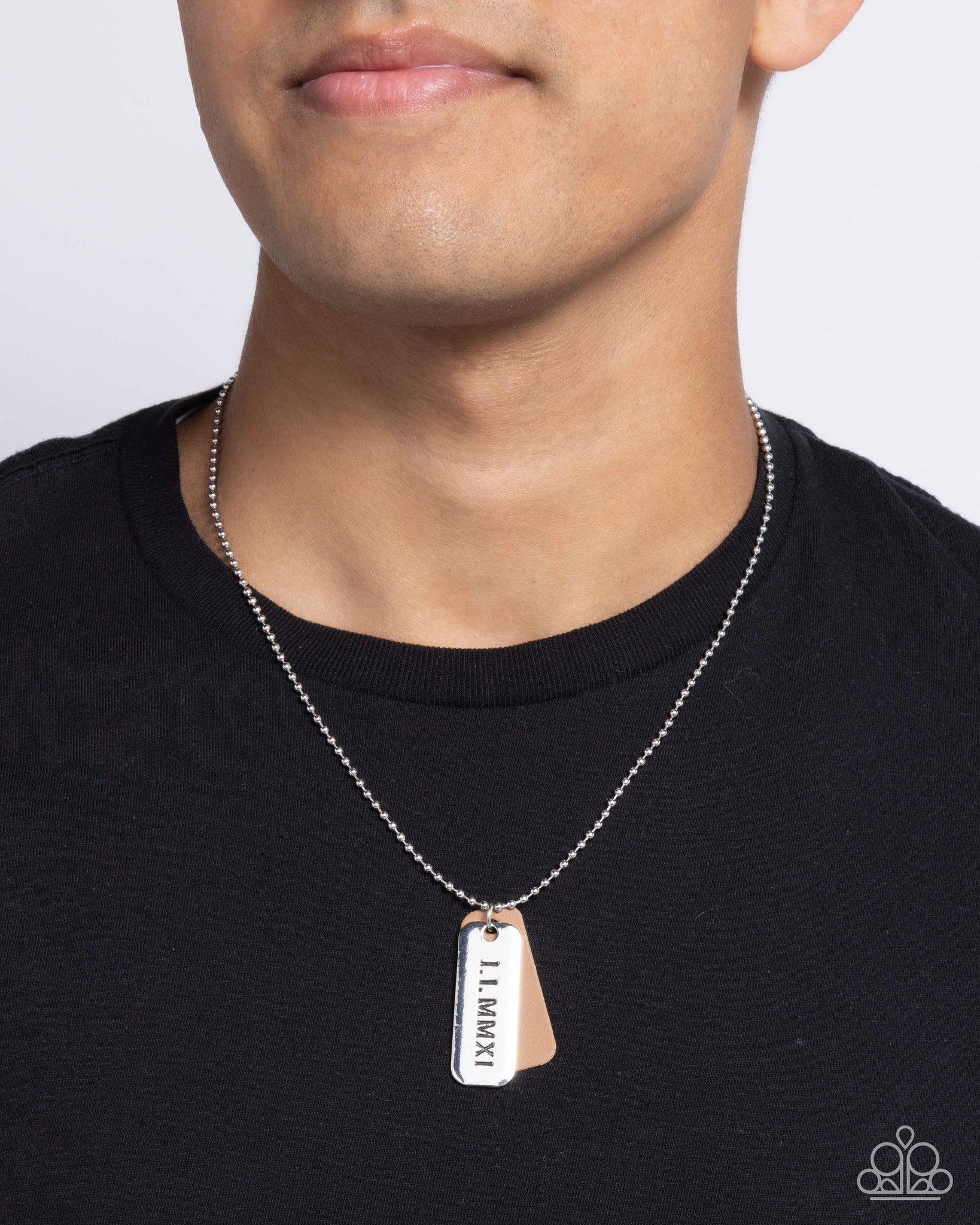 Gliding along a silver ball chain, a brown leather pendant is layered behind a Roman Numeral-stamped silver pendant for a unique urban look. Features an adjustable clasp closure.