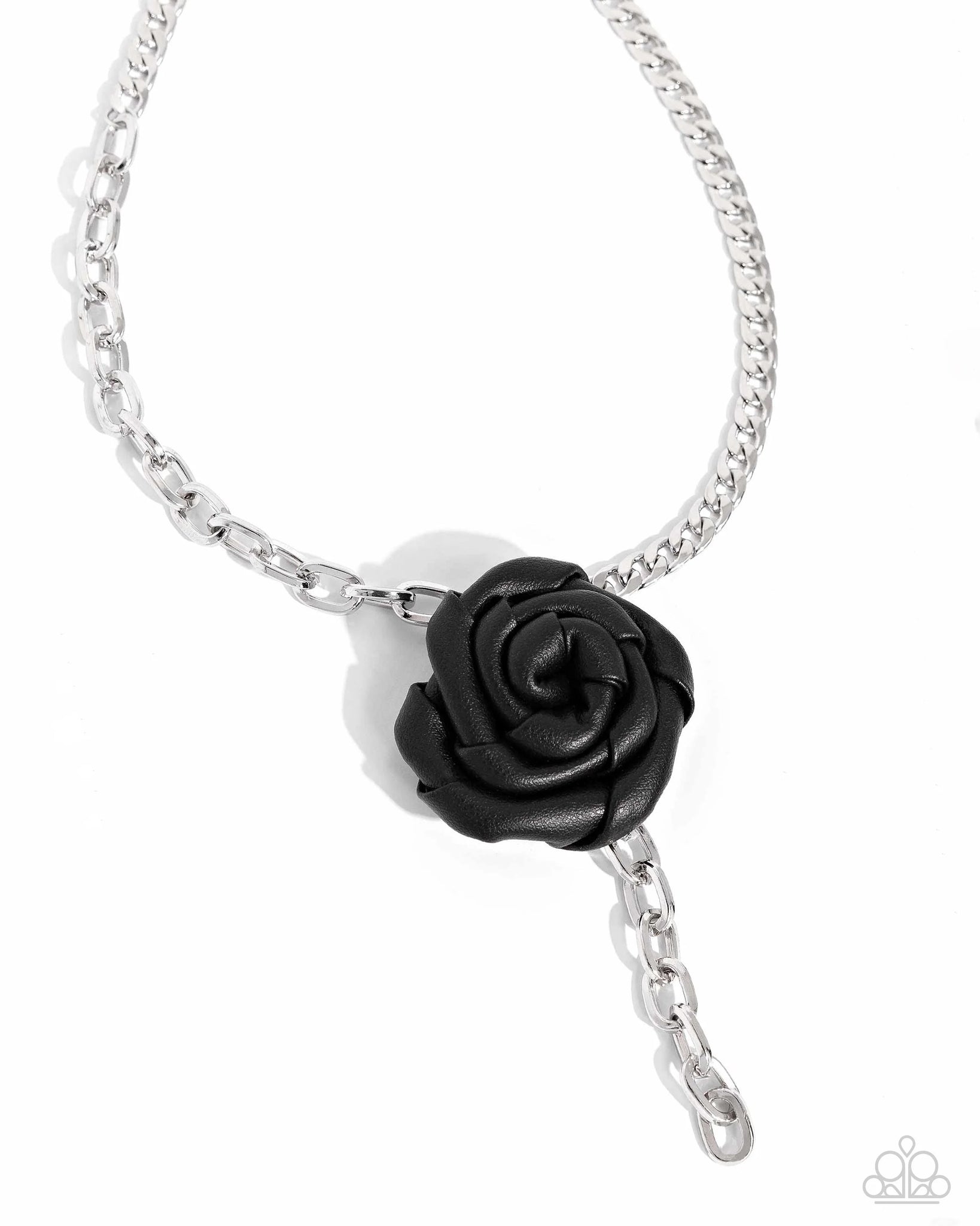 A silver cable chain collides with a silver curb chain to create a monochromatic blend of grit. A black leather rosette hangs below the contrasting chains, adding a whimsically edgy touch. The black leather rosette gives way to a solitaire silver chain strand for additional edgy detail. Features an adjustable clasp closure.