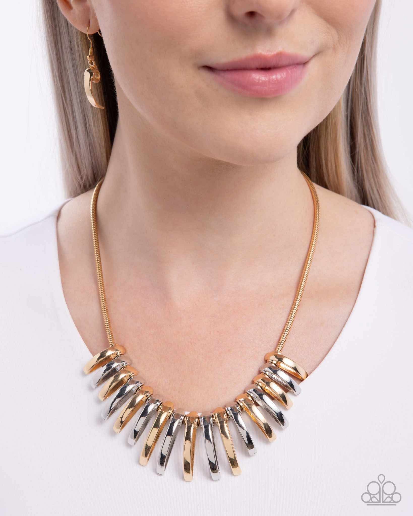 Gradually increasing in size, a collision of sleek arched silver and gold rings slides along a classic gold snake chain below the collar, creating a bold industrial statement piece. Features an adjustable clasp closure.