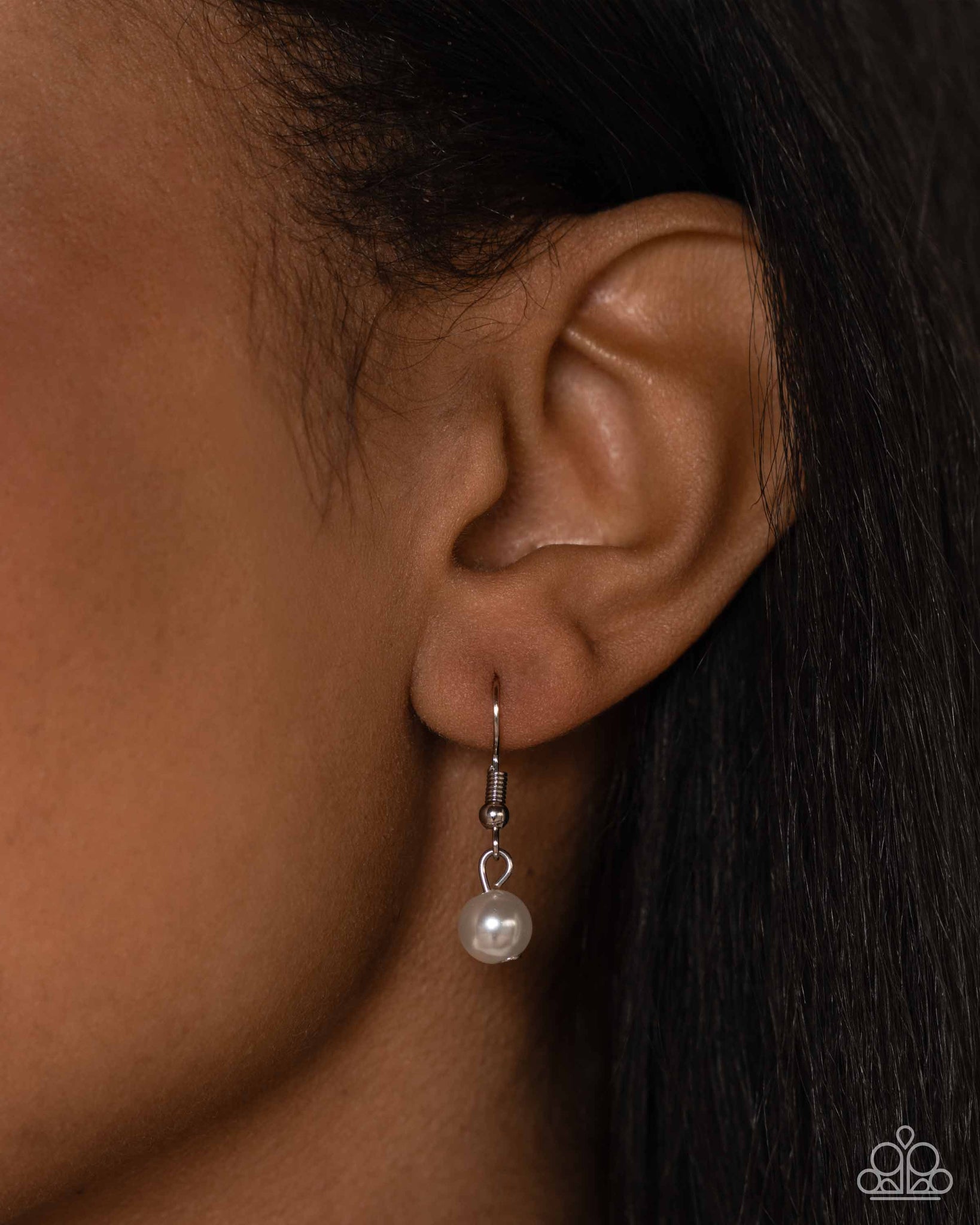 Threaded along a flexible wire that coils halfway around the neckline, faceted silver beads are joined by glossy white pearls that gradually increase in size towards the collarbone, creating a refined display. Strands of dainty white rhinestones in pronged silver fittings, additional pearls in varying sizes, and silver ornaments dusted in dainty white rhinestones dramatically sway between the centermost pearls for a fanciful fringed finish. Features an open-ended design.