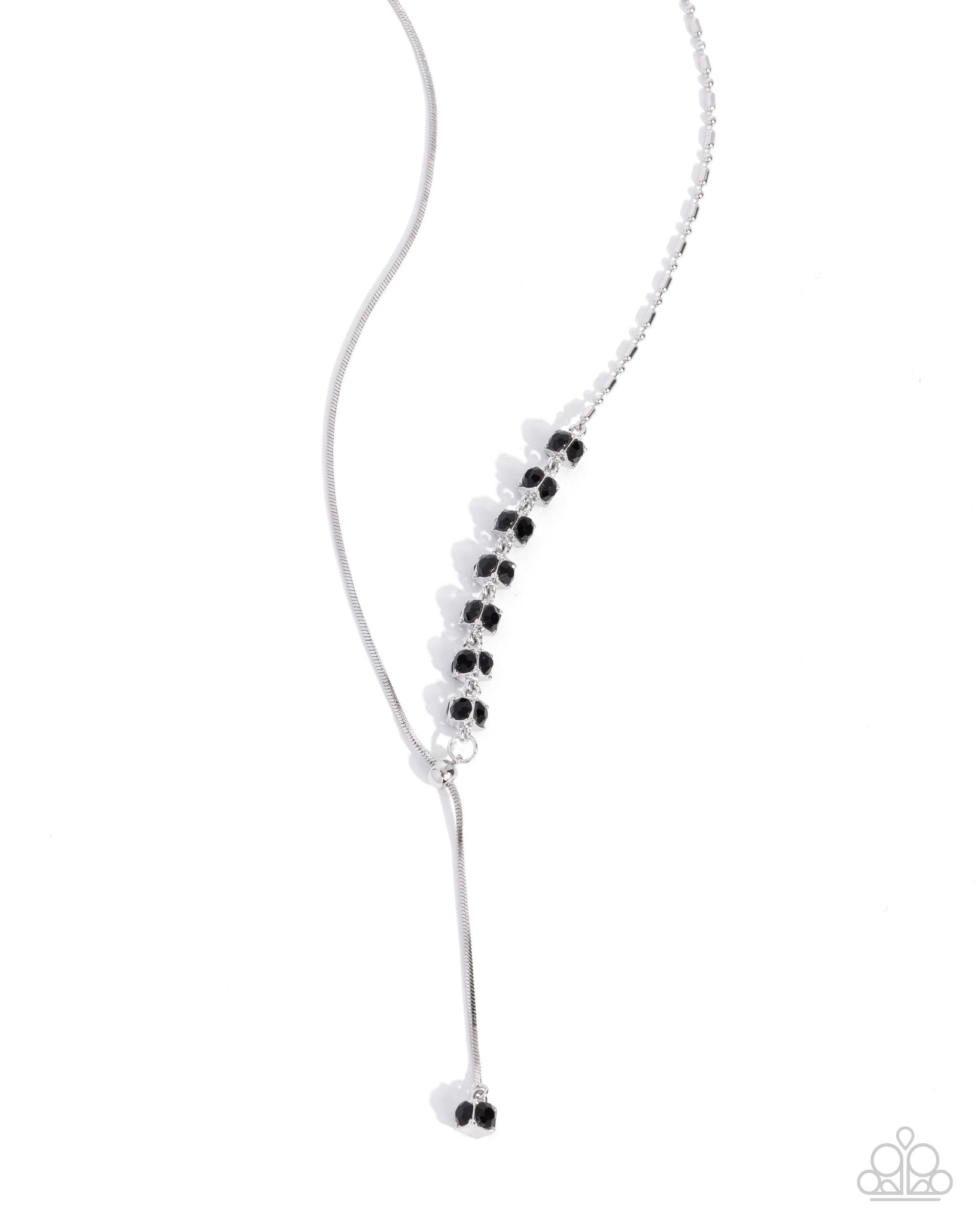 Attached to a ball-and-bar silver chain, a collection of black rhinestone-embellished silver cubes is attached to a solitaire silver bead that glides along a silver snake chain, creating an adjustable, awe-inspiring lariat of glitzy geometrics. An additional black rhinestone-embellished silver cube glistens from the bottom of the snake chain for additional shimmer.