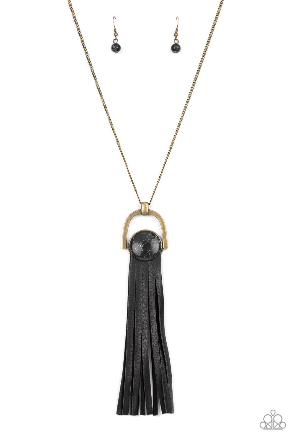 Strips of black leather fan out from the bottom of a round black stone that is threaded along a metal rod that attaches to the bottom of a brass horseshoe frame. The earthy pendant swings from the bottom of an extended brass chain, resulting in a wildly wonderful tassel. Features an adjustable clasp closure.