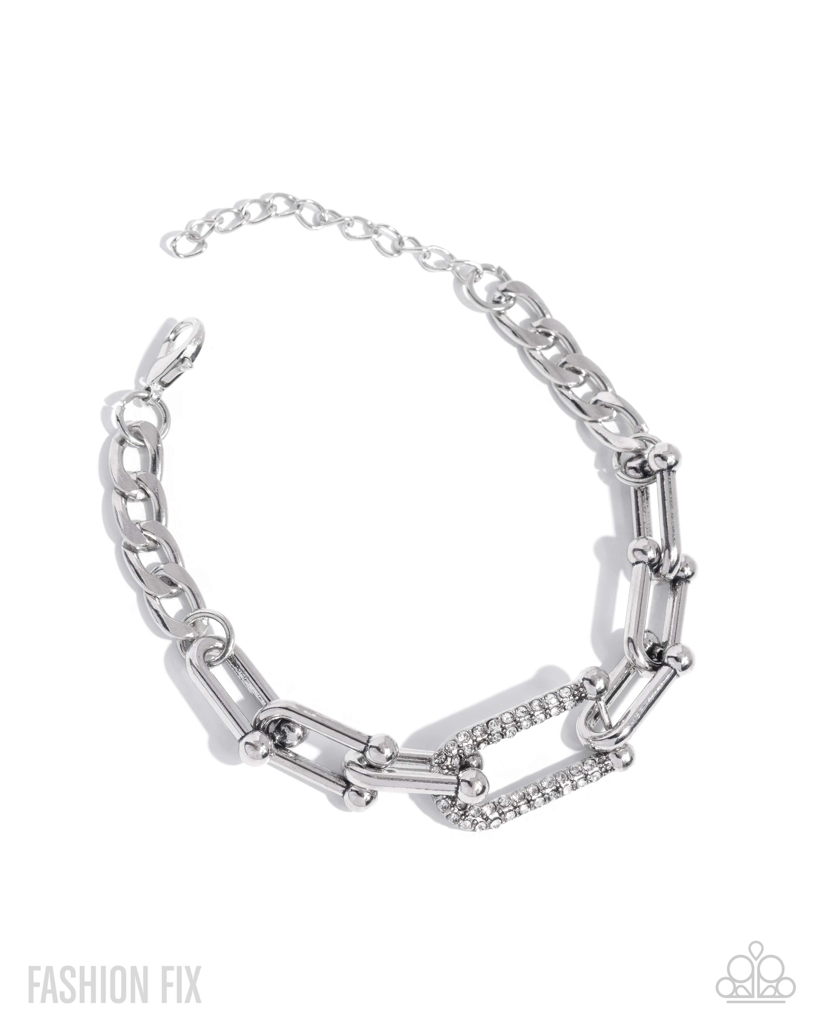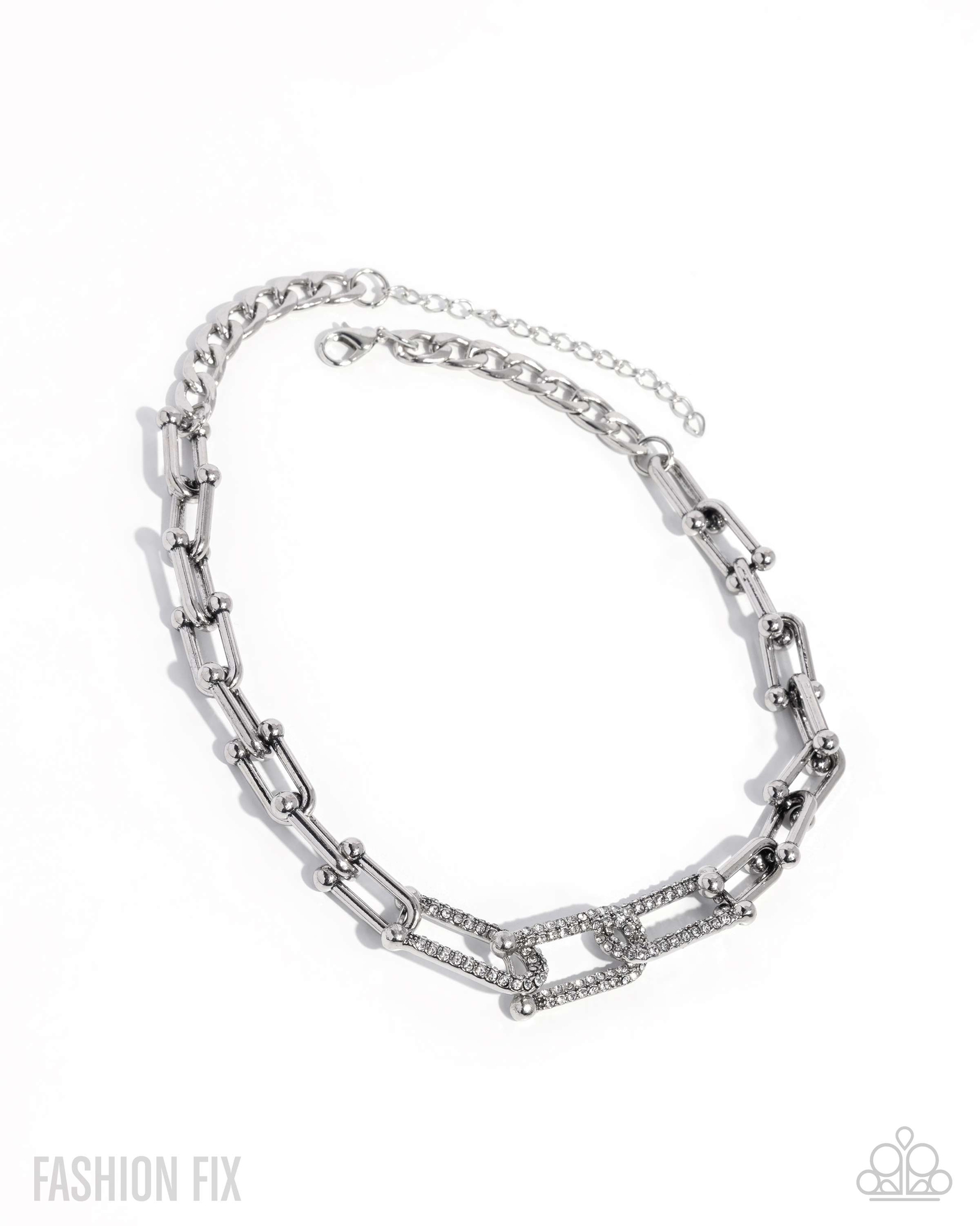 Gradually increasing in size, a shiny silver curb chain elongates into silver chain links looping around the neckline. Three of the larger shiny silver links are embellished with glistening white rhinestones for an understated shimmery finish. Features an adjustable clasp closure.
