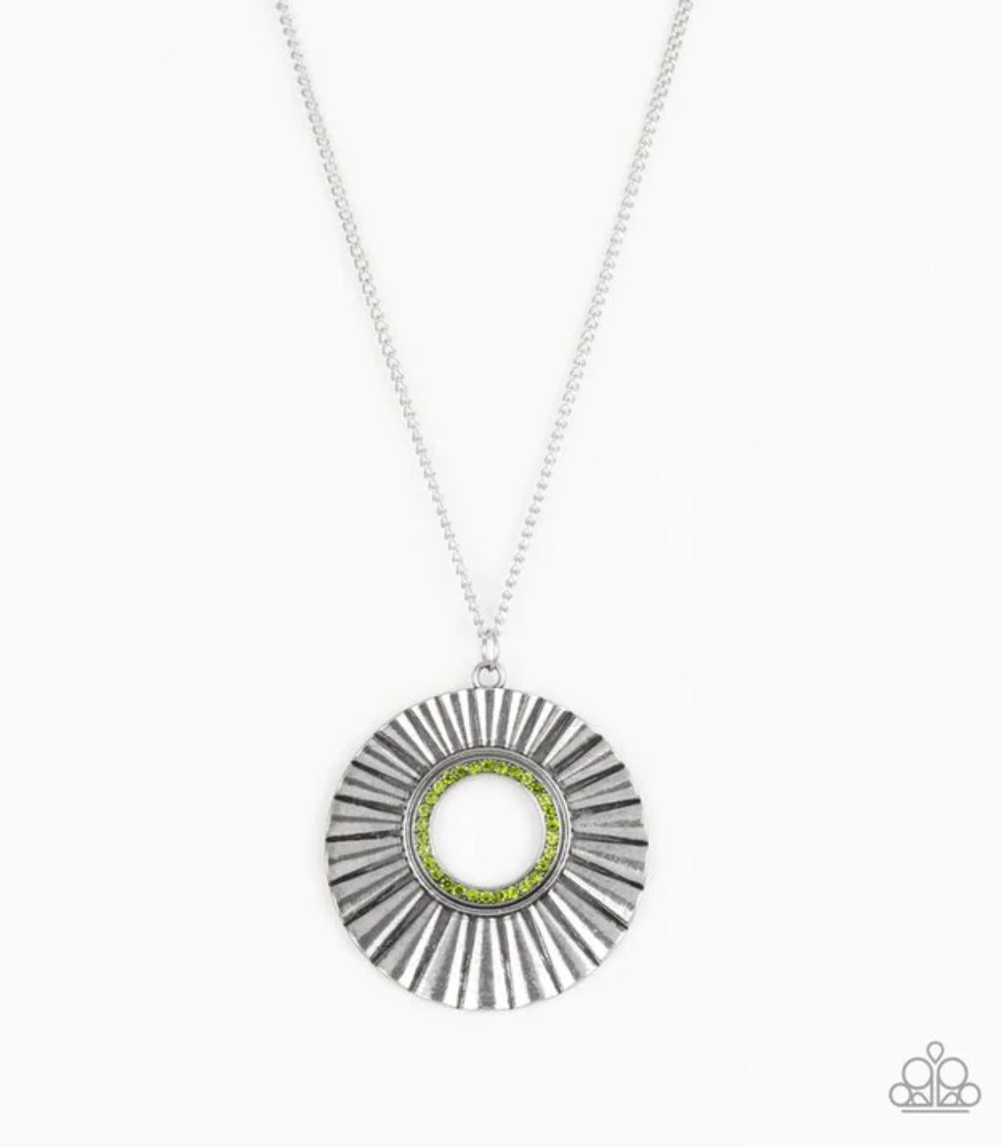 Brushed in a gritty antiqued finish, a rippling silver frame flares from a green rhinestone encrusted center for an edgy look. Features an adjustable clasp closure. Sold as one individual necklace. Includes one pair of matching earrings.