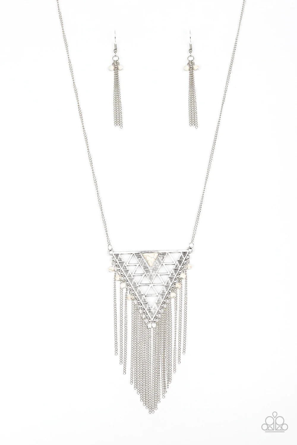 Stamped in geometric patterns, an airy triangular pendant swings from the bottom of a lengthened silver chain. Infused with a refreshing white stone, the tribal inspired pendant gives way to shimmery silver chains and dainty stone beads for a wanderlust finish. Features an adjustable clasp closure.