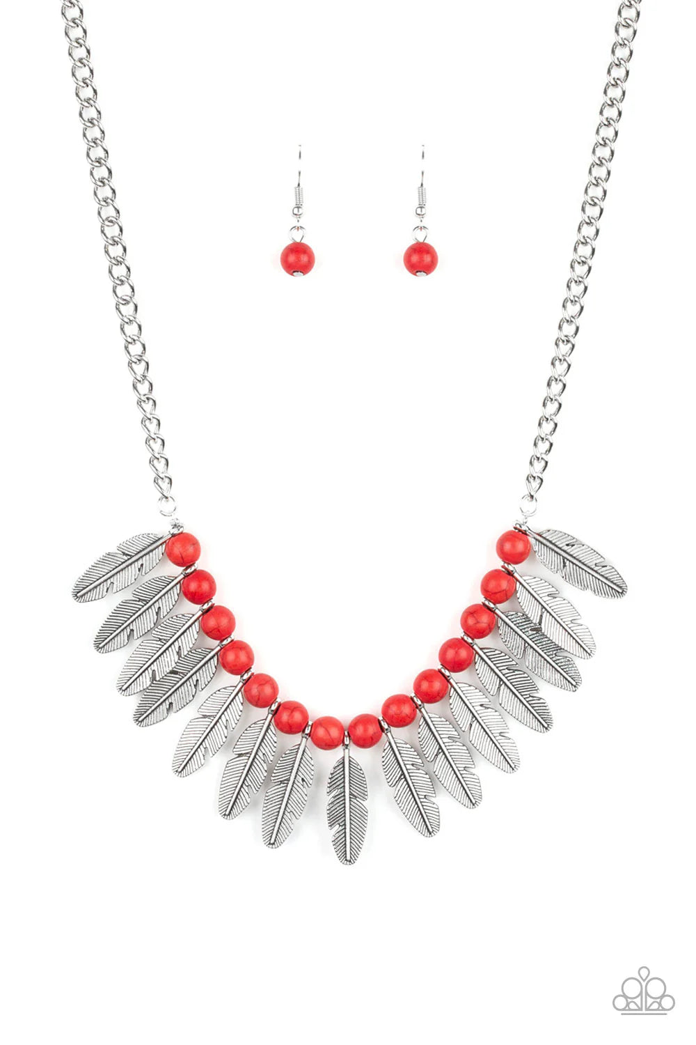 A collection of fiery red stone beads and shimmery silver feathers alternate below the collar, creating a whimsical fringe. Features an adjustable clasp closure.