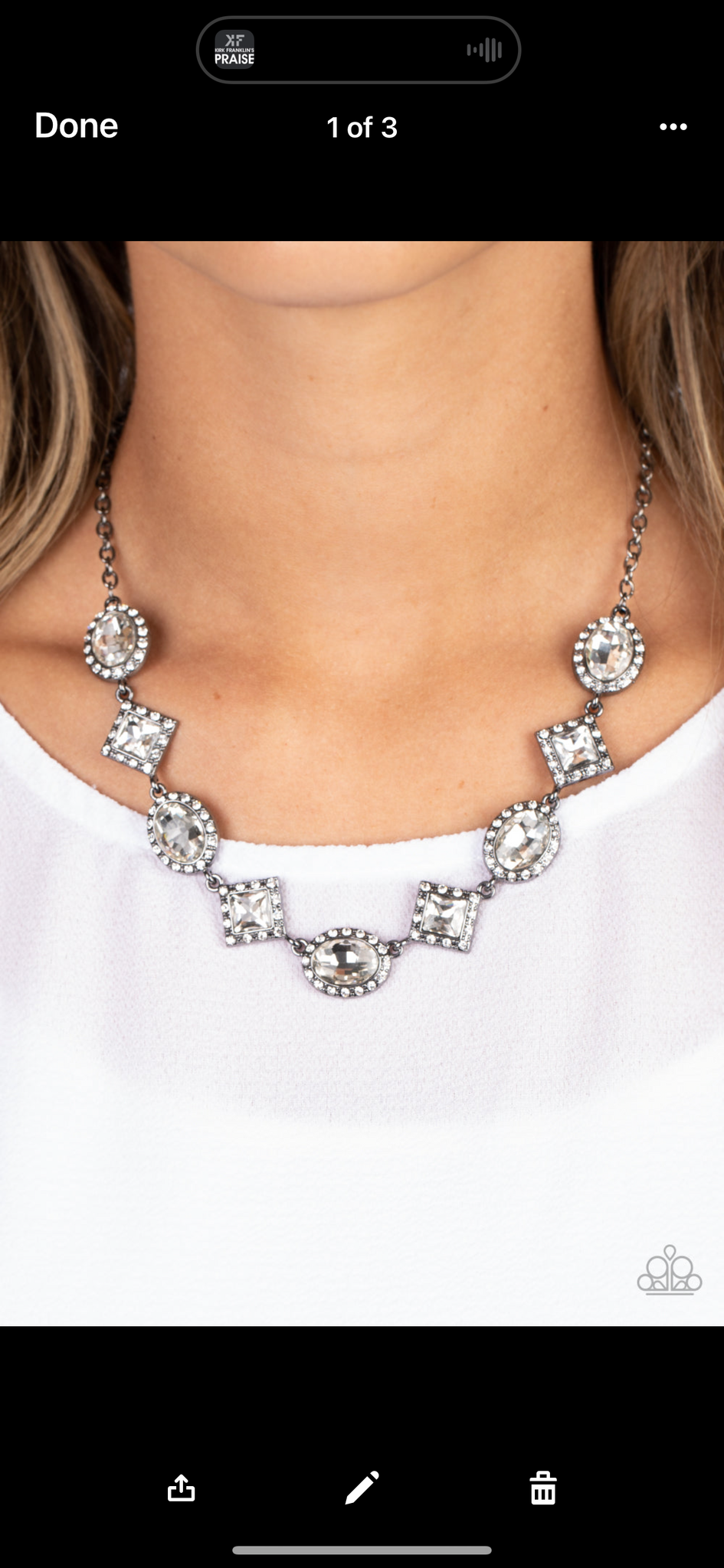 P2RE-BKXX-428XX Dazzling white rhinestones, in both oval and square cuts, fall along the collar in an alternating pattern. Each gem is set against a backdrop of gunmetal and bordered by tiny white rhinestones, amplifying their sparkle. In a dramatic finish, the square-cut gems are tilted on a point to maximize their impact. Features an adjustable clasp closure.