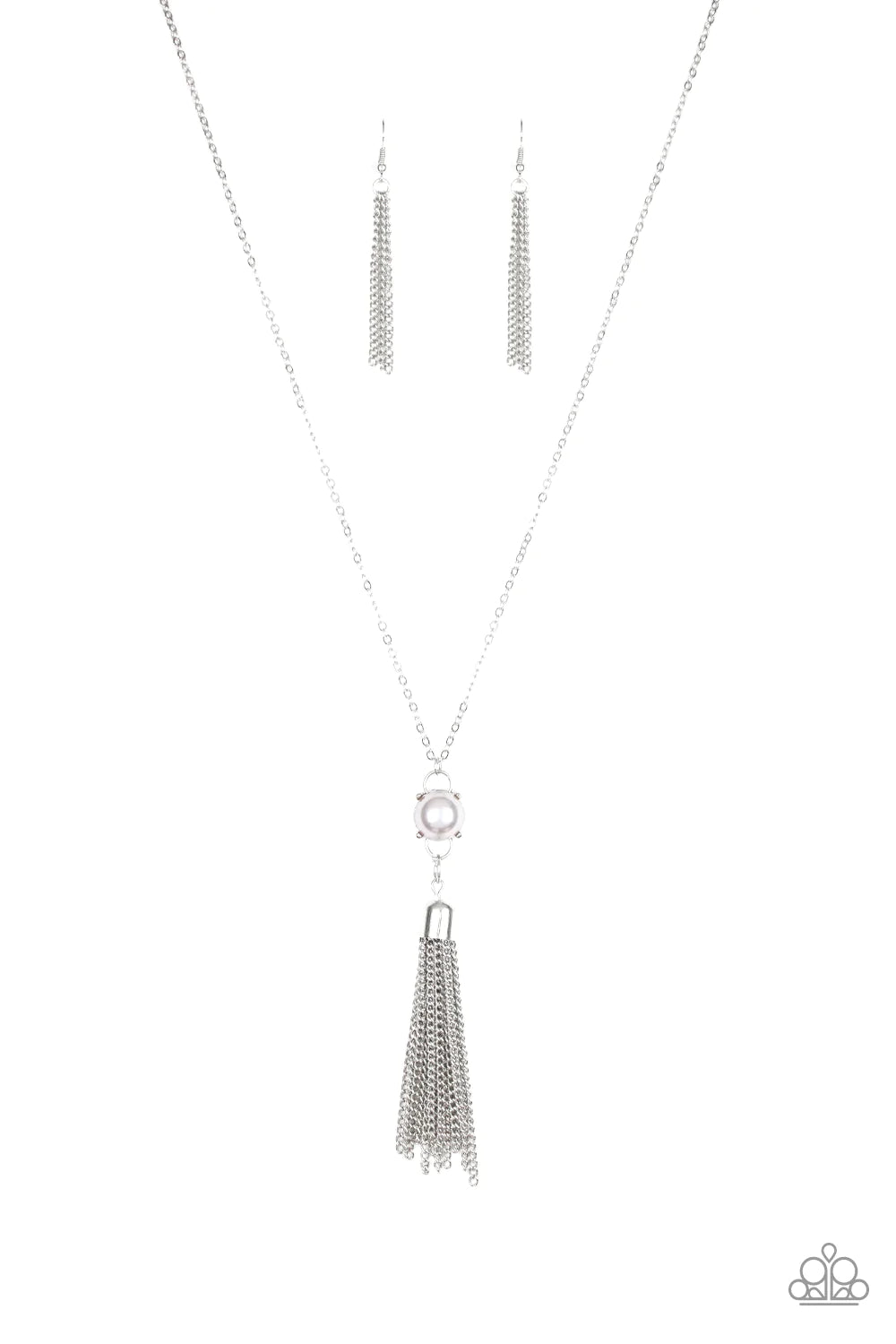 A silver pearl dotted frame gives way to a shimmery silver chain tassel, creating a timelessly stacked pendant at the bottom of a lengthened silver chain. Features an adjustable clasp closure.