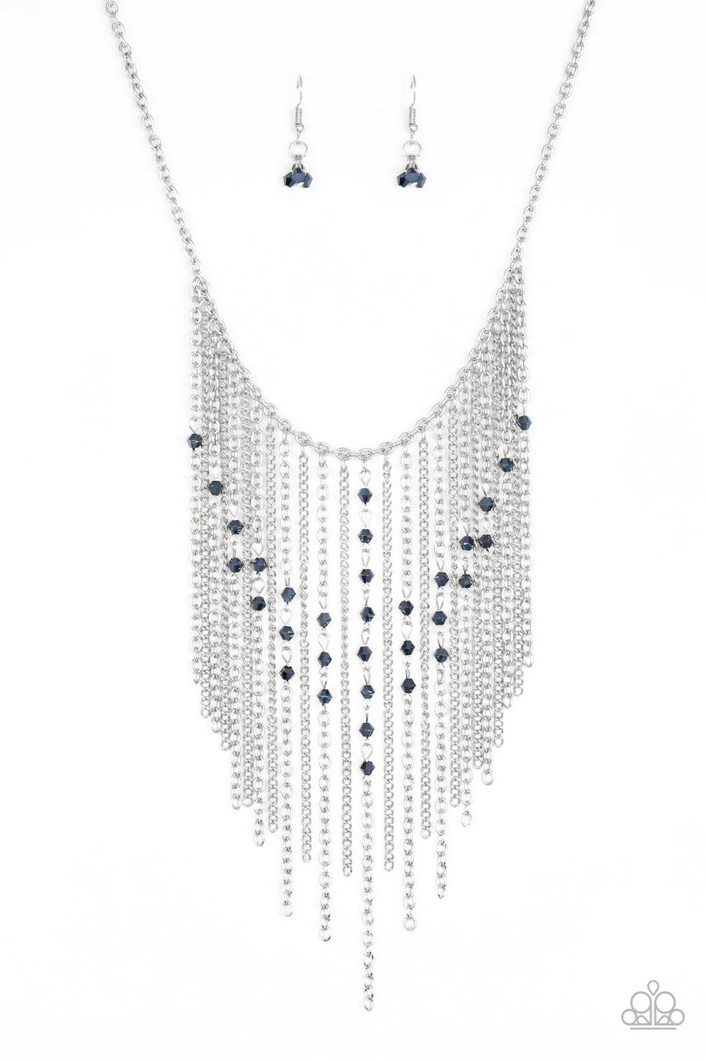 Varying in length, mismatched silver chains stream from the bottom of a classic silver chain. Faceted metallic blue crystal-like beads sporadically dot the free-falling chains, creating a statement-making fringe below the collar. Features an adjustable clasp closure. Sold as one individual necklace. Includes one pair of matching earrings.