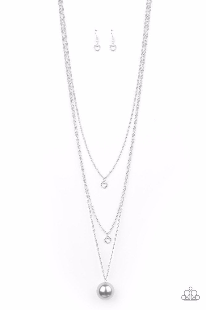 Three shimmery silver chains cascade down the chest. Two dainty silver heart charms swing from the uppermost chains, giving way to a dramatically oversized silver pearl for a romantic finish. Features an adjustable clasp closure. Sold as one individual necklace. Includes one pair of matching earrings.