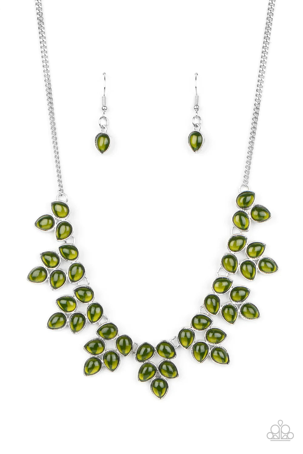Glassy Military Green teardrop beads cluster into leafy frames below the collar, creating a whimsically ethereal fringe. Features an adjustable clasp closure.