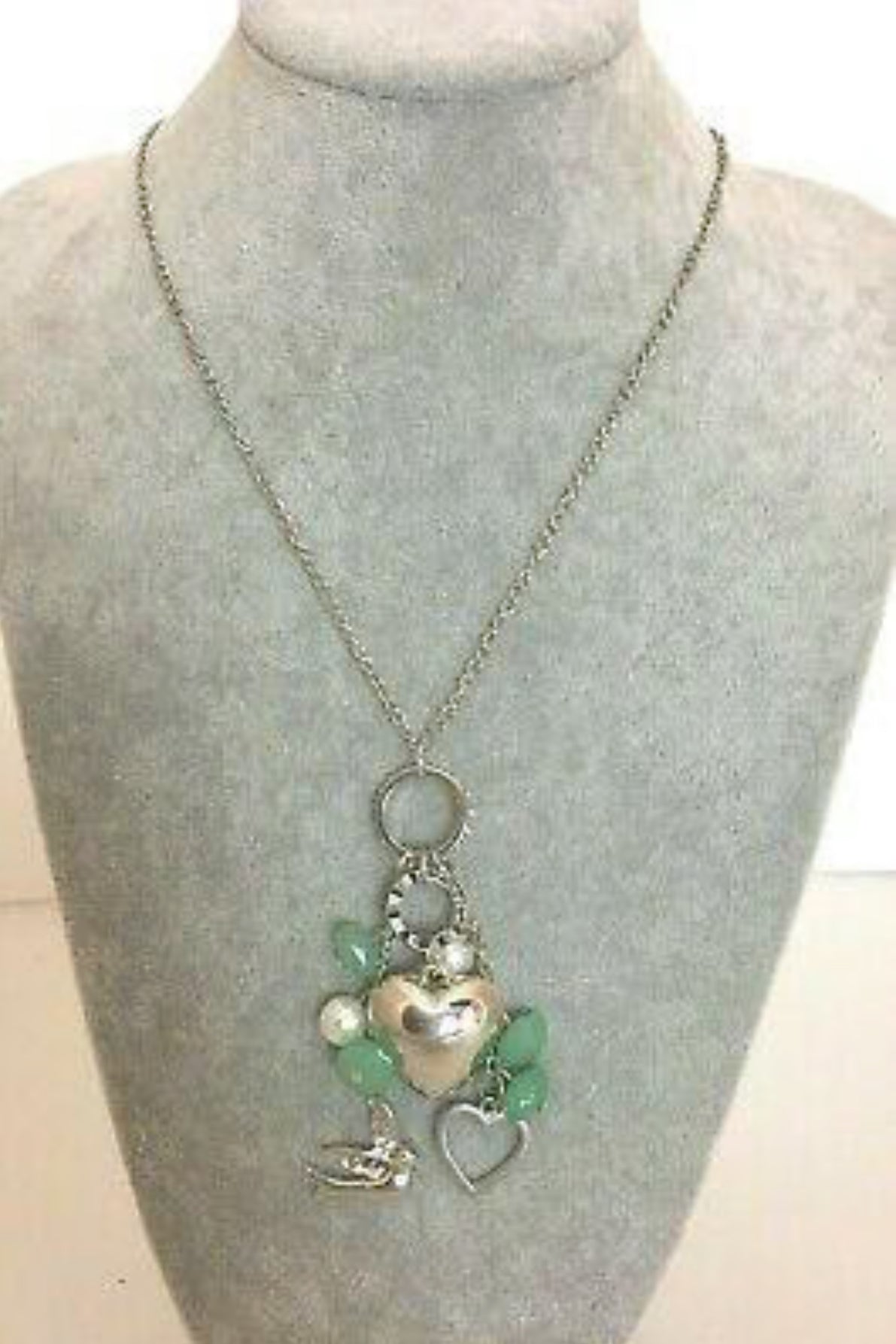 A silver bird charm, silver heart charms, and collection of white pearls and opaque green crystal-like beads swing from the bottom of a lengthened silver chain for a whimsically clustered look. Features an adjustable clasp closure. Sold as one individual necklace. Includes one pair of matching earrings.