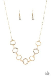 Glistening gold hoops link with white rhinestone encrusted hoops below the collar for a timeless shine. Features an adjustable clasp closure.
