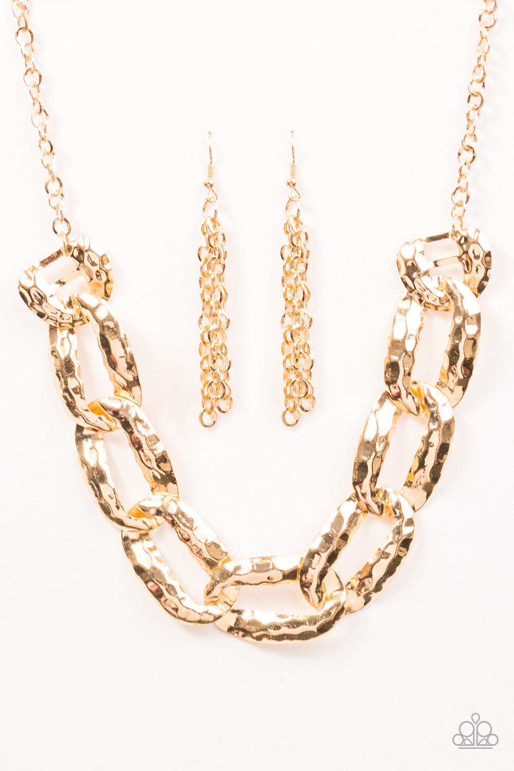 Large gold links featuring glistening hammered textures hangs just below the collar for a spectacular industrial inspired display. Features an adjustable clasp closure.